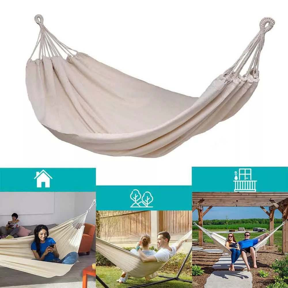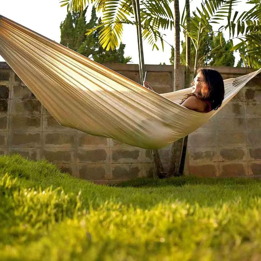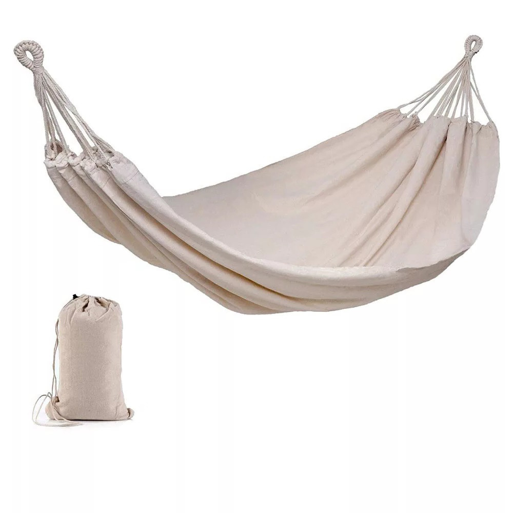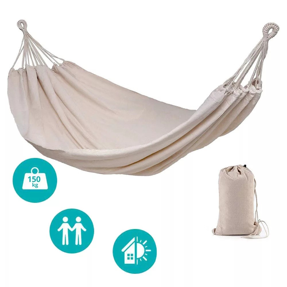 Teremts nyugodt, természetes hangulatot ezzel a kényelmes, bézs színű kétszemélyes függőággyal, amely ideális választás kertbe, teraszra, erkélyre vagy akár utazáshoz is. Könnyen felszerelhető, kis helyen elfér, és a praktikus tárolózsáknak köszönhetően bárhová magaddal viheted – tökéletes társ a pihenéshez, bárhol is legyél.