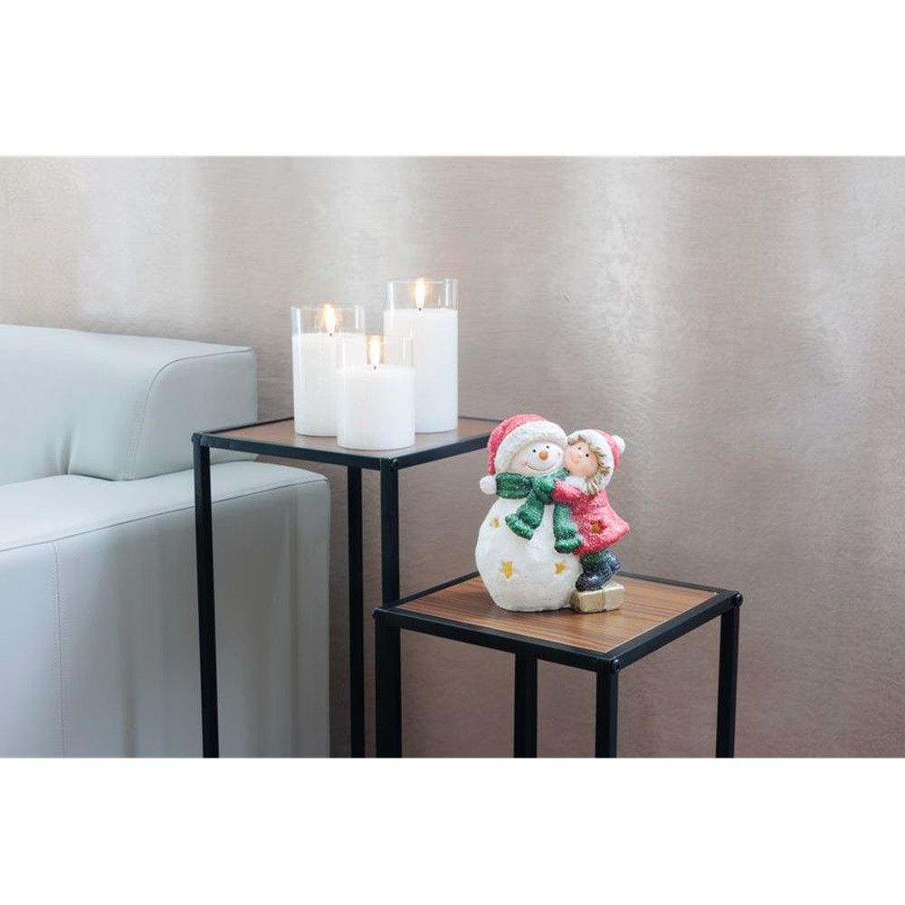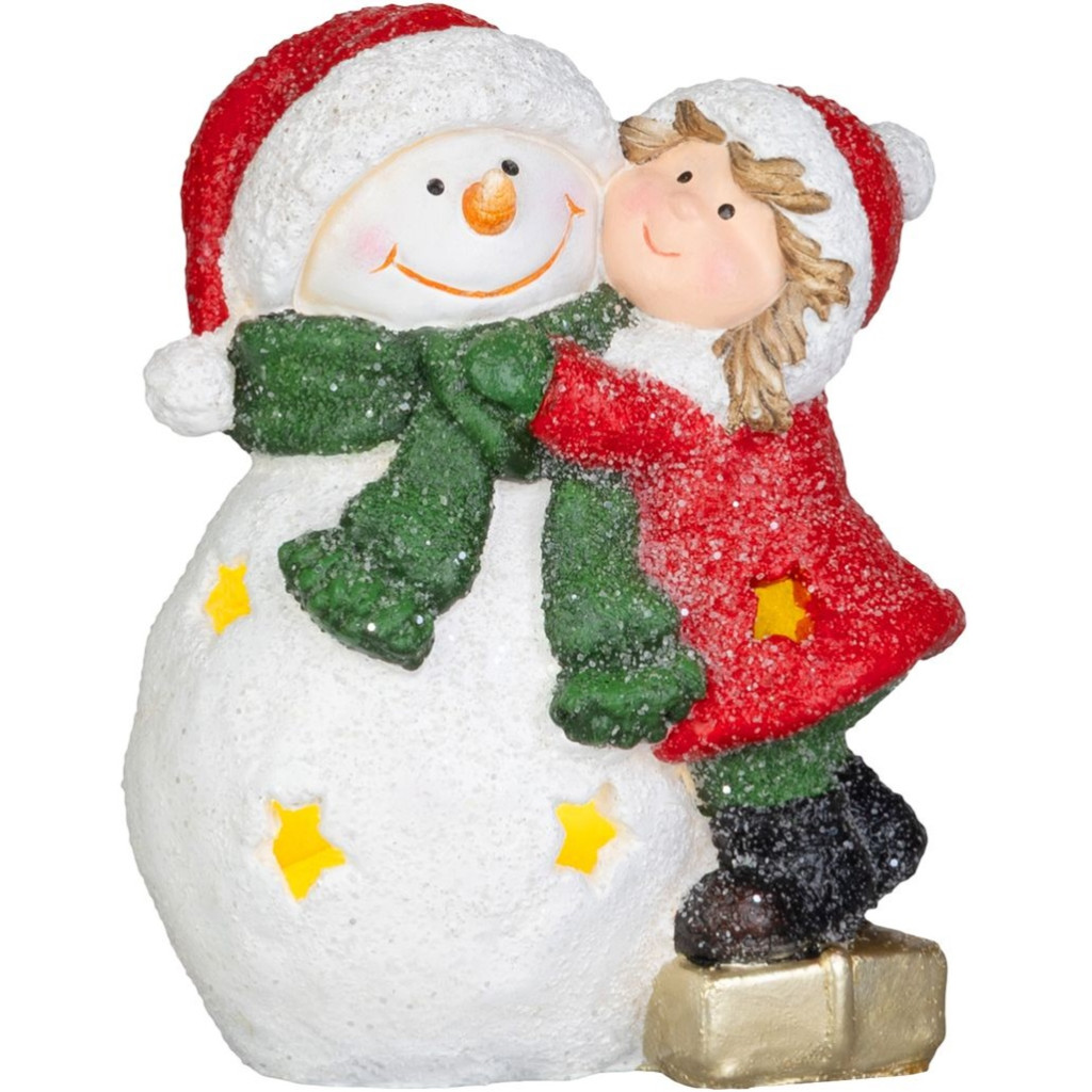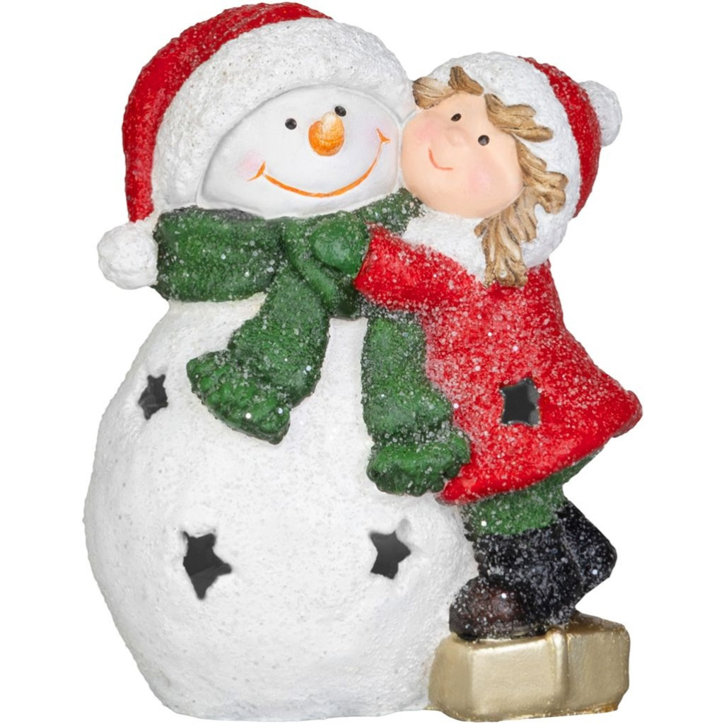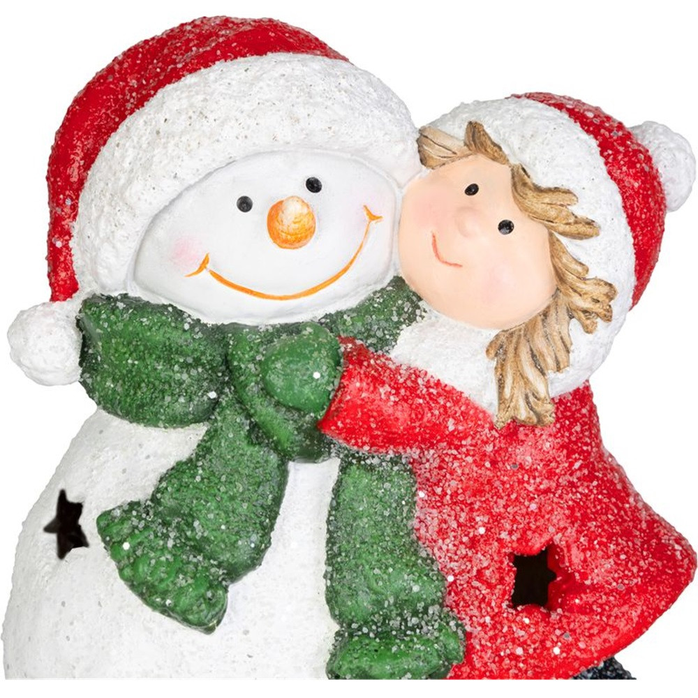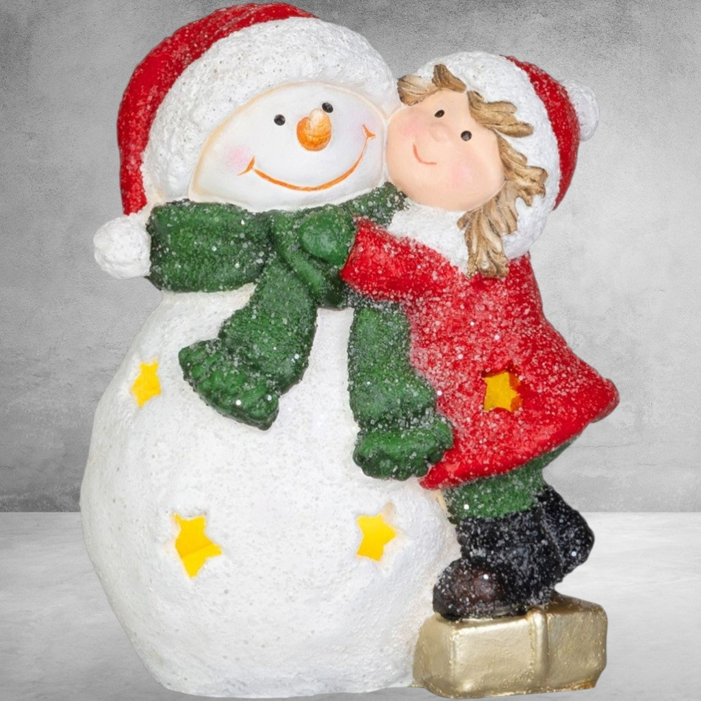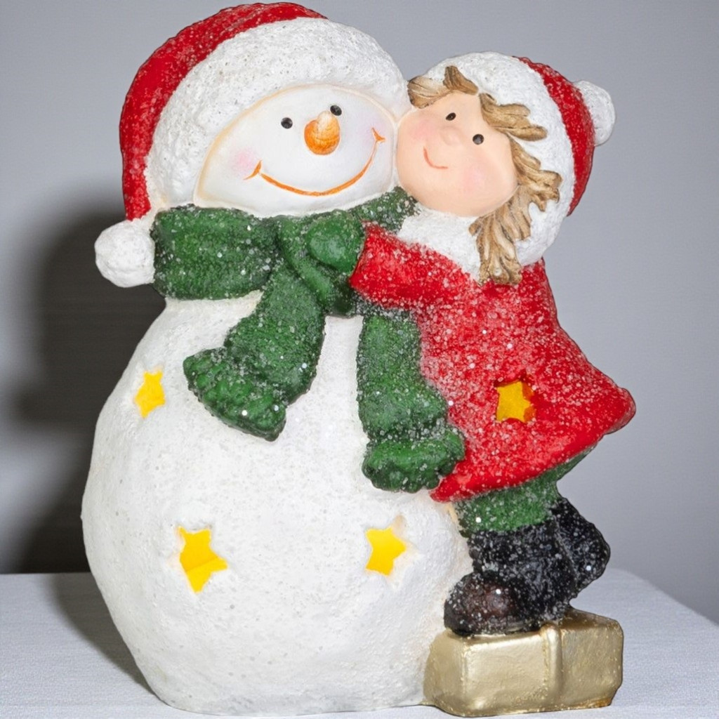 Ez a bájos, 12,5 x 8 x 15,8 cm méretű dekoráció egy kedves jelenetet ábrázol: egy gyereket hóemberrel. Vidám és barátságos hangulatot sugároz, amely azonnal otthonossá varázsolja a karácsonyi környezetet.