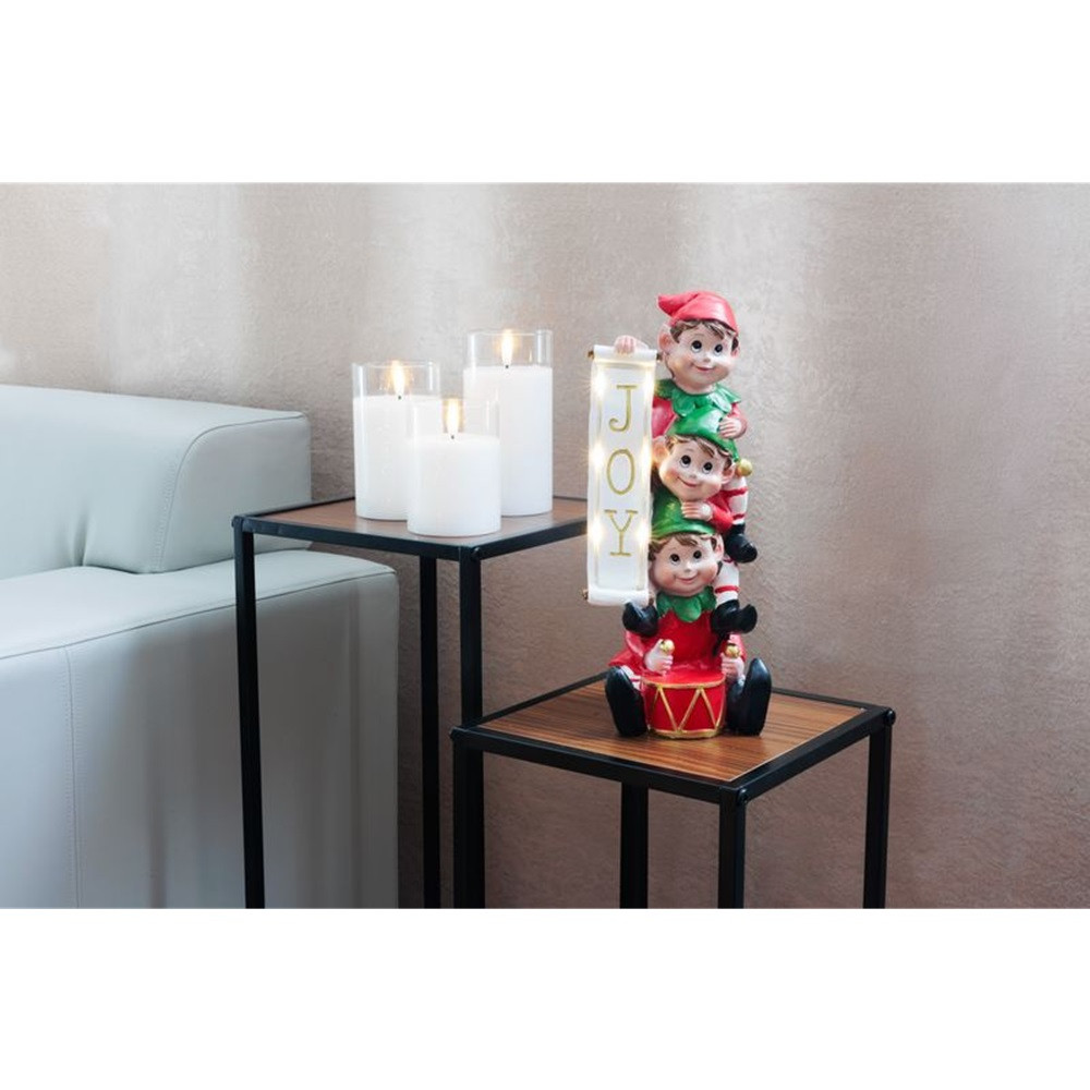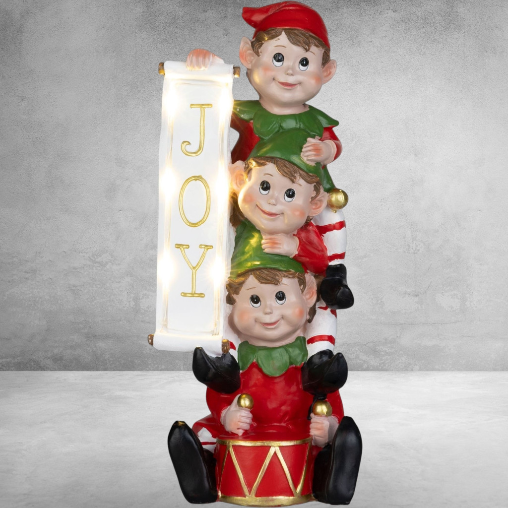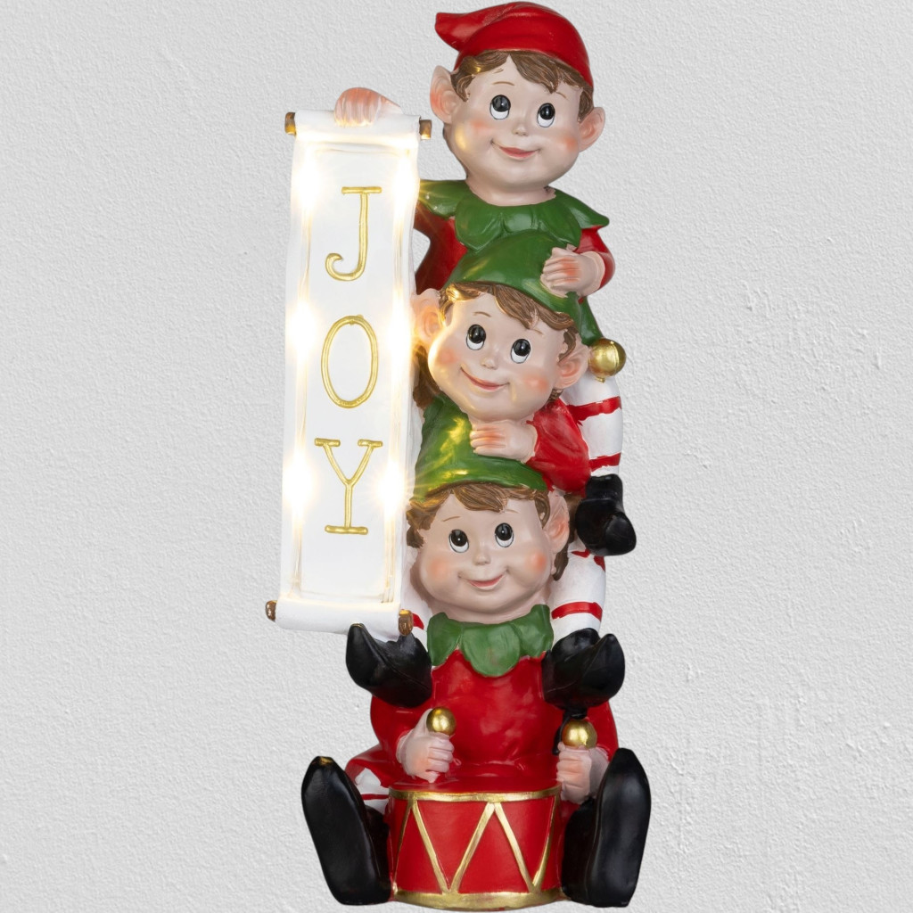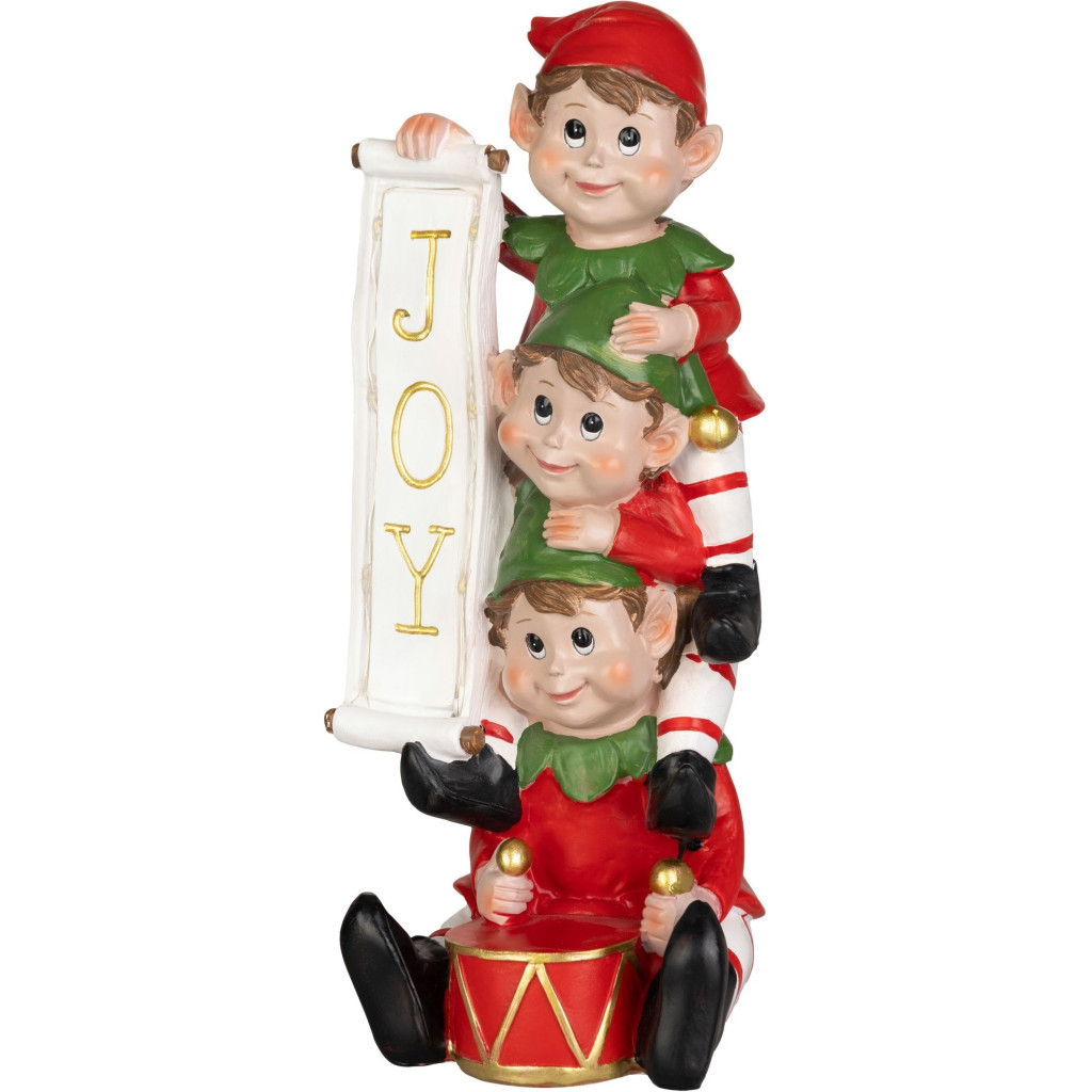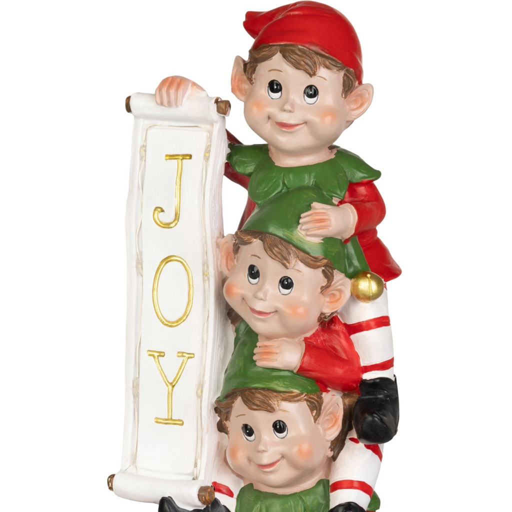 Ez a különleges, 13,3 x 12,5 x 30,5 cm méretű dekoráció három mókás manót ábrázol, akik egy „JOY” feliratot tartanak, szimbolizálva a karácsony örömét és játékosságát.