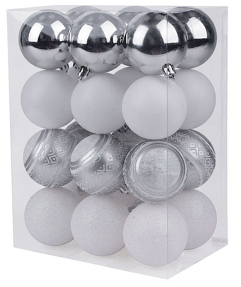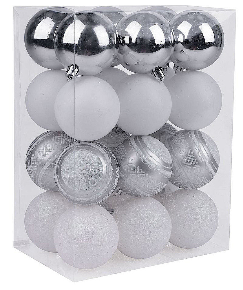 A készlet 24 db, 6 cm átmérőjű gömböt tartalmaz, amelyek ideális mérettel rendelkeznek bármilyen magasságú karácsonyfa díszítésére. Az egységes méret harmonikus összképet ad, ugyanakkor a fehér-ezüst szín játékosságot és eleganciát kölcsönöz.