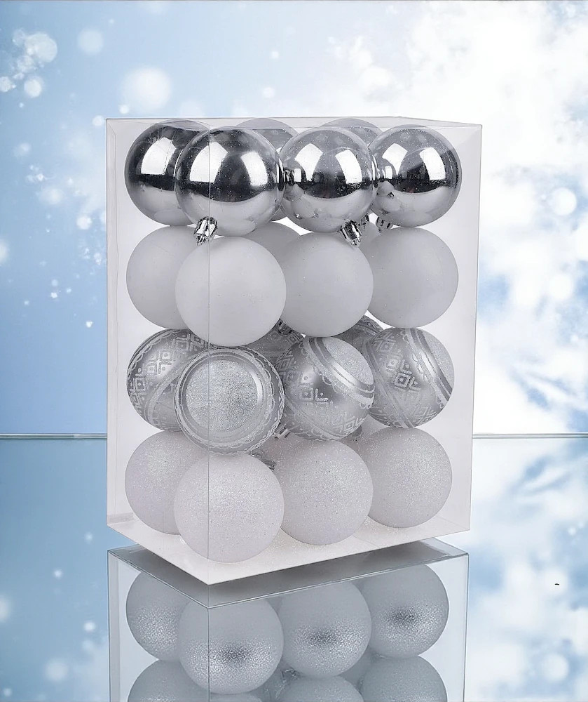 Tedd ünnepivé karácsonyfádat ezzel a 24 darabos fehér-ezüst karácsonyi gömb szettel, amely klasszikus és elegáns megjelenést biztosít. A fehér-ezüst színvilág tökéletesen illik a modern és a hagyományos karácsonyi dekorációkhoz egyaránt, így könnyen kombinálhatod más díszekkel is.