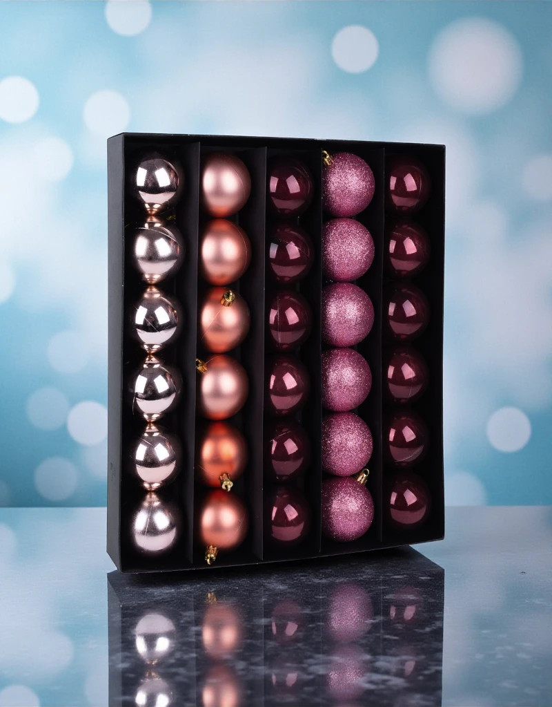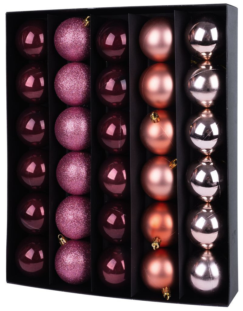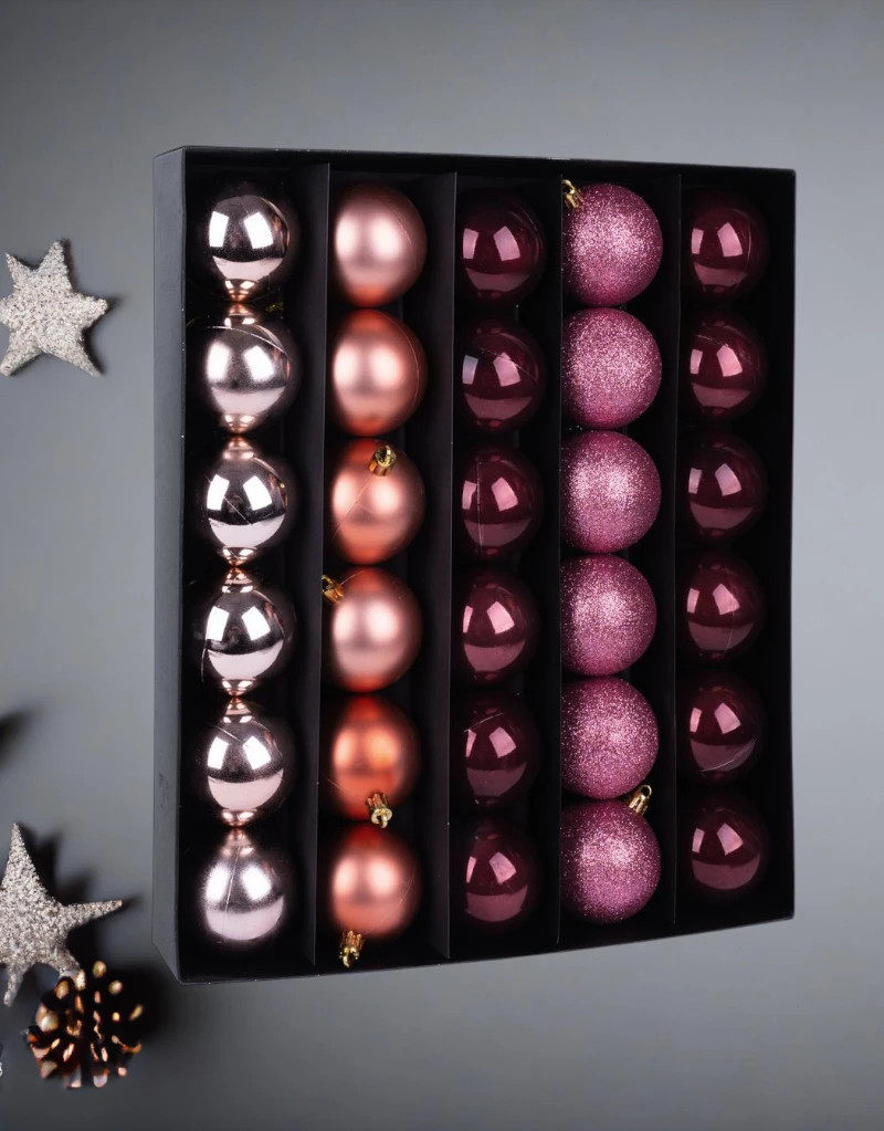 A készlet 30 db, 6 cm átmérőjű gömböt tartalmaz, amelyek ideális méretűek a karácsonyfa harmonikus díszítéséhez. A réz és rózsaszín kombinációja egyedi, elegáns összhatást kelt, így a fa igazán ünnepi középpontja lesz a lakásnak.