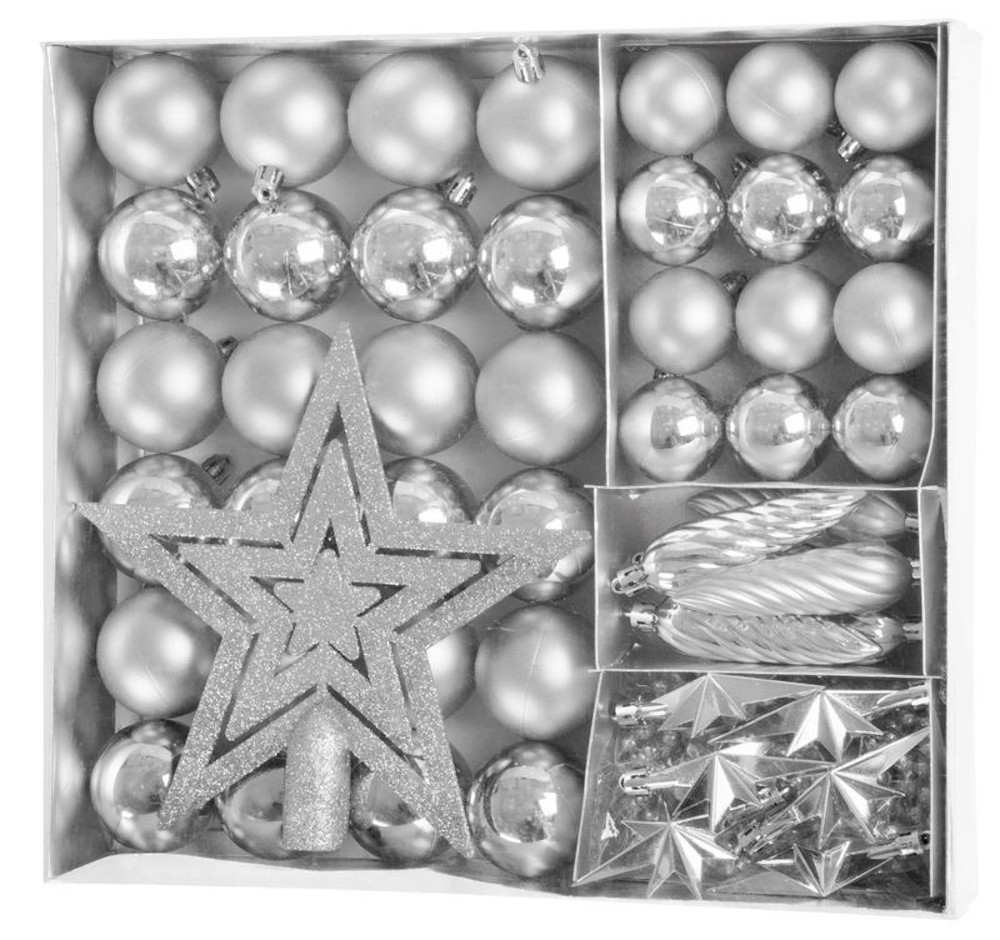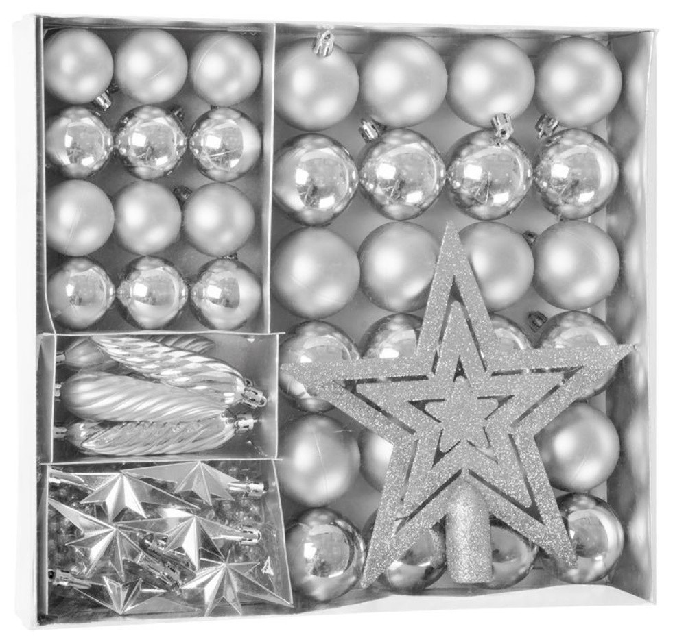 Alakítsd ragyogóvá karácsonyfádat az elegáns 50 darabos karácsonyfa díszkészlettel, amely tökéletes alapot ad az ünnepi dekorációnak. Az ezüst szín kifinomult, modern, csillogó hangulatot teremt, amely remekül illik klasszikus és kortárs karácsonyi enteriőrökbe is.