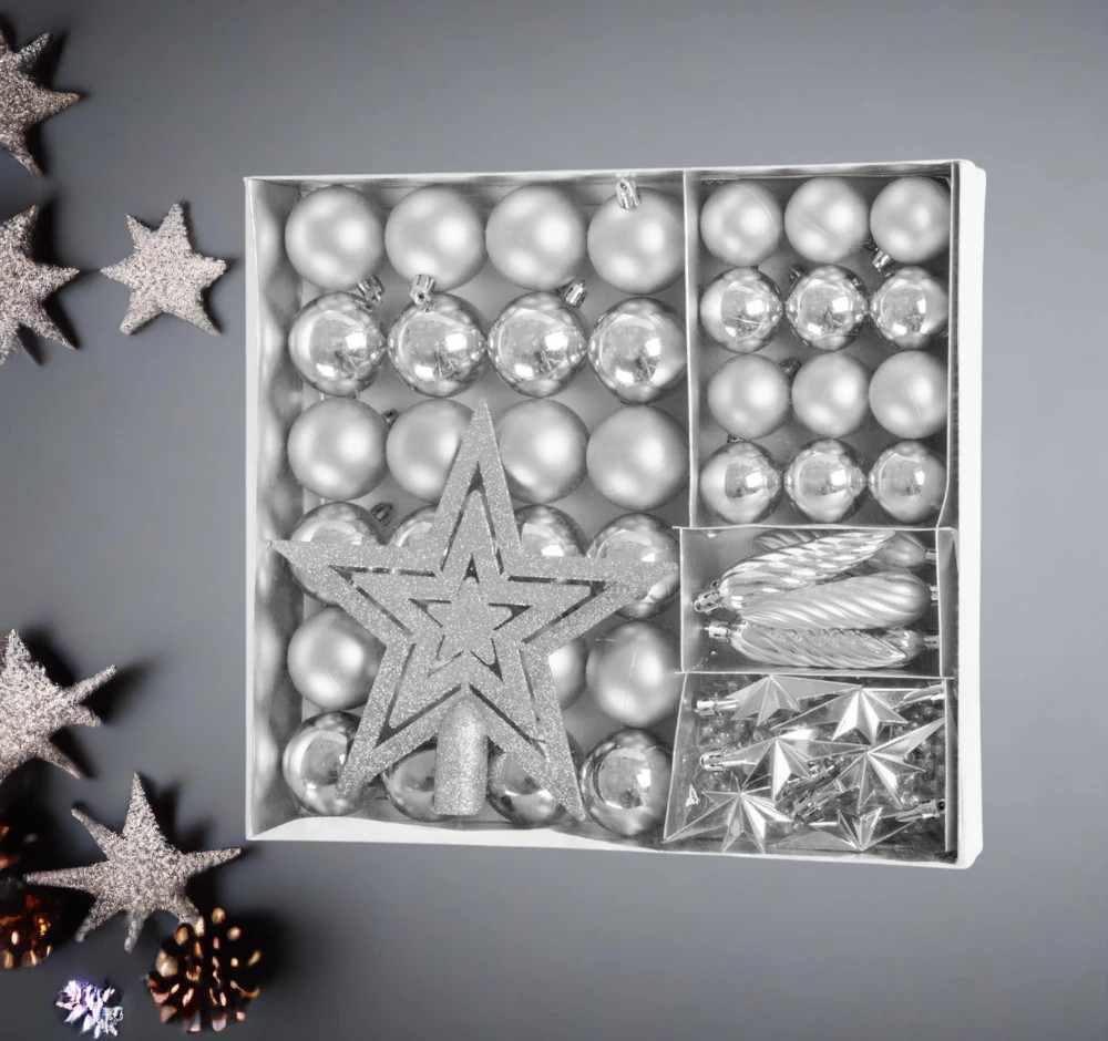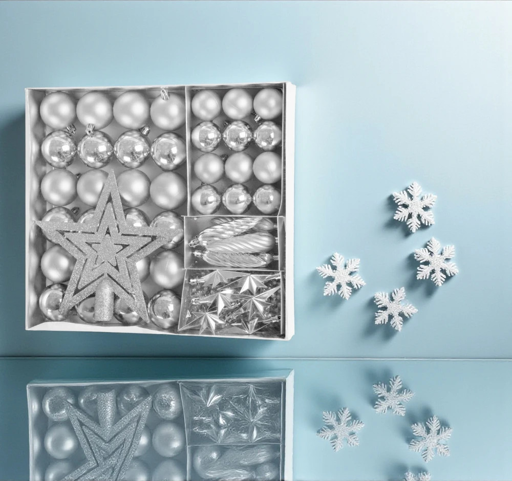 Egészítsd ki karácsonyi dekorációdat ezzel az ezüst karácsonyfa díszkészlettel, amely időtlen eleganciát és ragyogó ünnepi fényt hoz otthonodba.