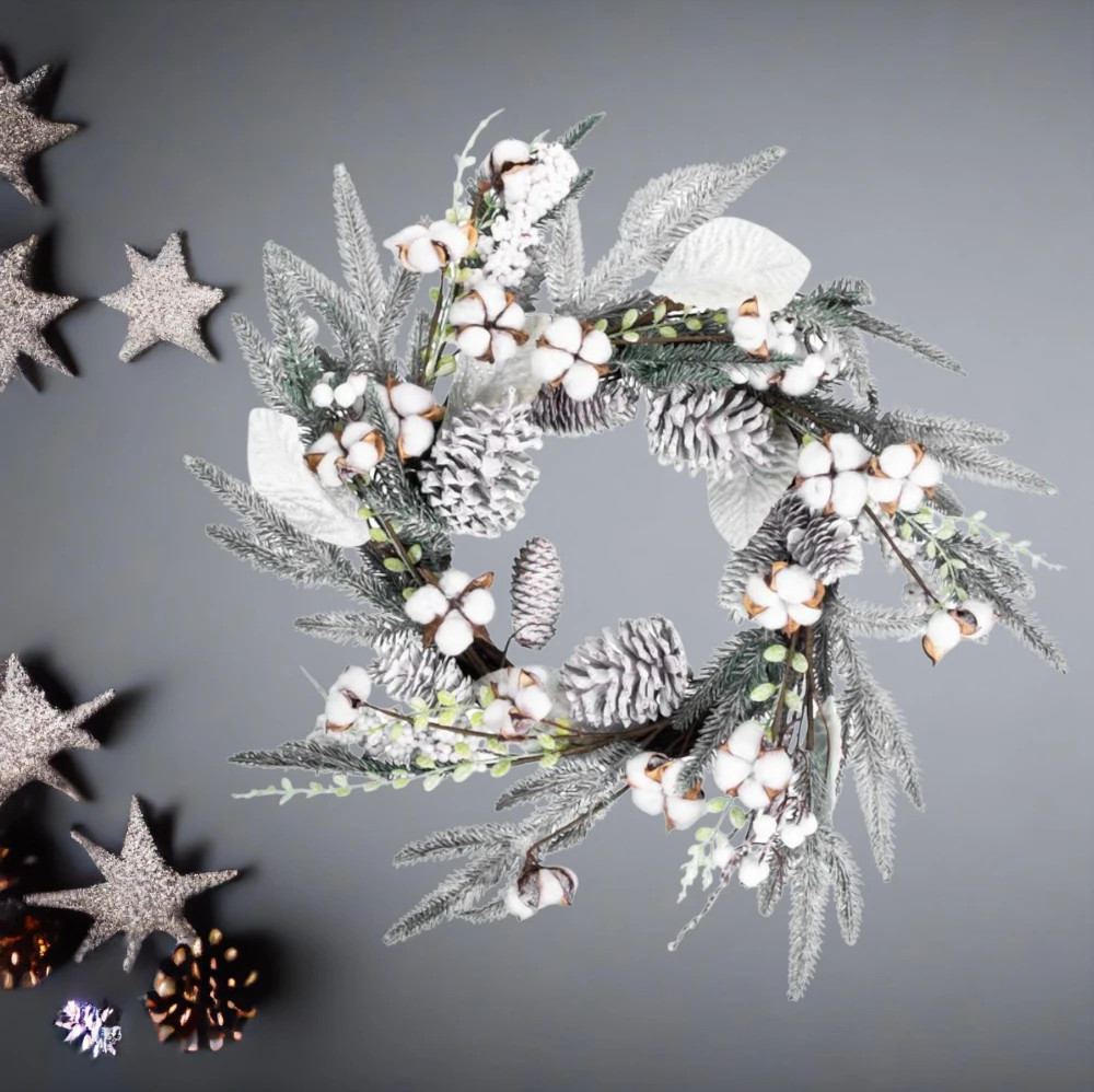 A koszorút borító havas fenyőágak a tél szépségét idézik, miközben természetes és autentikus megjelenést biztosítanak. Letisztult stílusa miatt tökéletesen illik hagyományos és modern karácsonyi dekorációkhoz is.