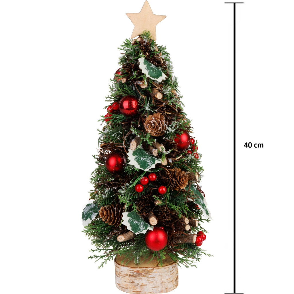 Ez a 40 cm magas, talapzaton álló karácsonyfa tökéletes választás, ha kisebb helyiségekbe vagy asztalra keresel mutatós dekorációt.