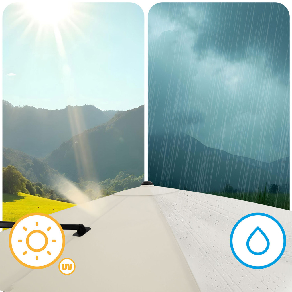 Könnyedén kezelhető kurblija és 360°-ban forgatható váza folyamatosan követi a nap járását, anélkül hogy mozgatnod kellene a talpat. A kereszt alakú alap stabil tartást ad, amely homokkal vagy járólapokkal terhelve viharosabb időben is megbízható. A mellékelt vízlepergető huzat megóvja a ponyvát a portól és az UV-sugárzás idő előtti fakító hatásától, így a napernyő hosszú távon is esztétikus marad.