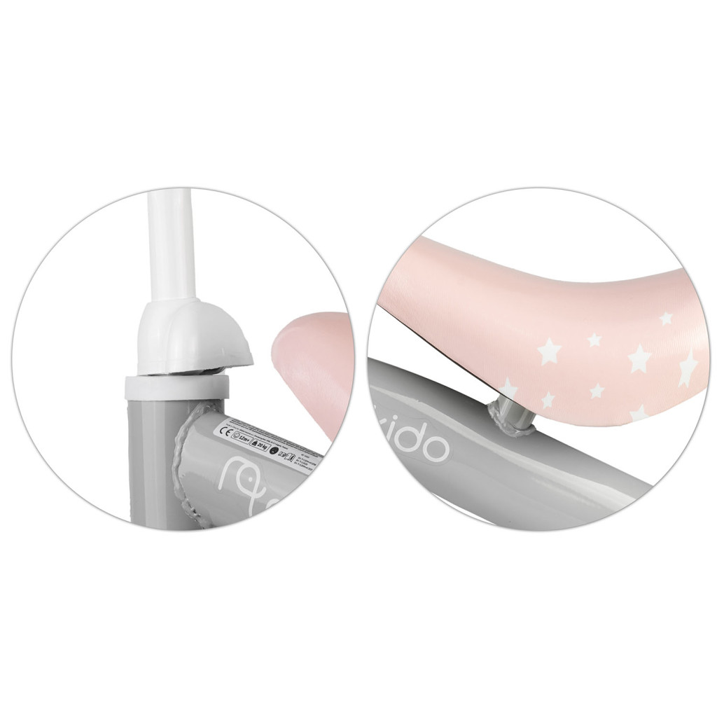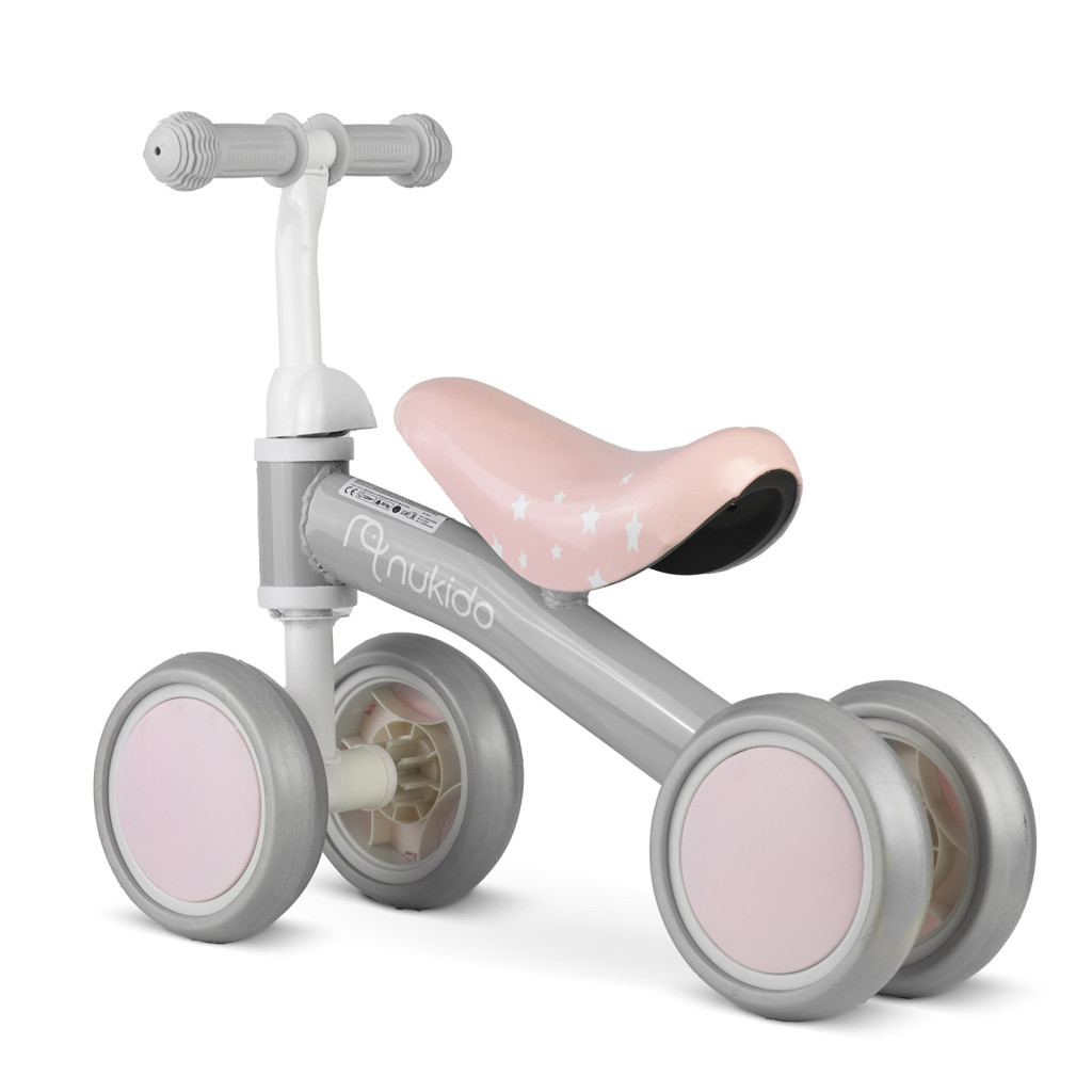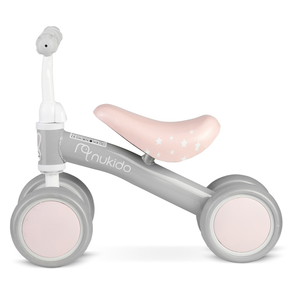 Fedezd fel a Nukido NK-600 futóbiciklit, amely négy stabil kerékkel és pehelykönnyű, mindössze 1,72 kg-os vázzal segíti a legkisebbek első gurulásait. A szürke–rózsaszín pasztell dizájn, a csillagmintás, ergonomikusan ívelt ülés és a nyuszis kormánydísz azonnal mosolyt csal a gyerekek arcára. A halk, gumírozott kerekek lakásban és udvaron is kímélik a padlót, a lekerekített élek pedig biztonságossá teszik az önfeledt száguldást.