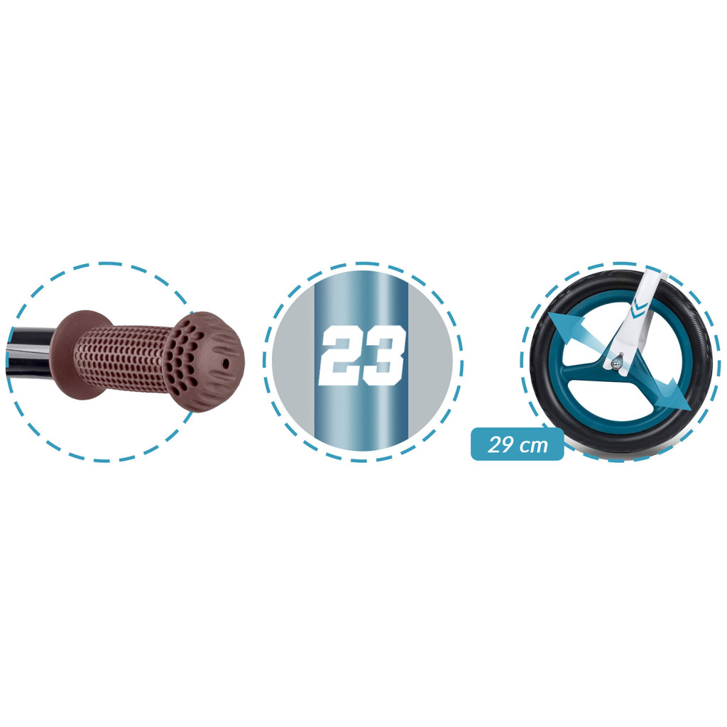 Ez a futóbicikli játékosan fejleszti a gyermek egyensúlyérzékét és koordinációját, miközben a defektmentes kerekeknek és a csúszásmentes markolatoknak köszönhetően bármilyen terepen megállja a helyét. A pehelykönnyű váz megkönnyíti a hordozást, a hátsó kézifék pedig biztonságos megállást tesz lehetővé. Az ergonomikus, párnázott ülés hosszabb séták során is kényelmet biztosít, így a Fun Adventure nemcsak tanulóeszköz, hanem kedvenc játszótárs is egyben.