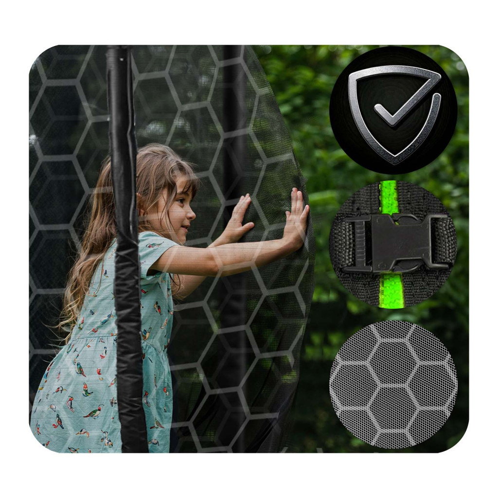 A nagy, 435 cm-es átmérő akár több gyermek vagy felnőtt egyidejű szórakozását is lehetővé teszi, miközben a belső háló megakadályozza, hogy lelépj a rugókra. A stabil, W alakú lábak erős talajfogást biztosítanak, a sűrű szövésű háló pedig ellenáll az időjárás viszontagságainak. A gondosan párnázott peremnek köszönhetően bátran kipróbálhatod a magasabb ugrásokat is, a tartós anyagok pedig hosszú éveken át garantálják az önfeledt szabadtéri élményt.