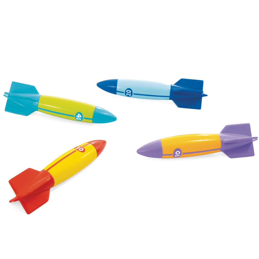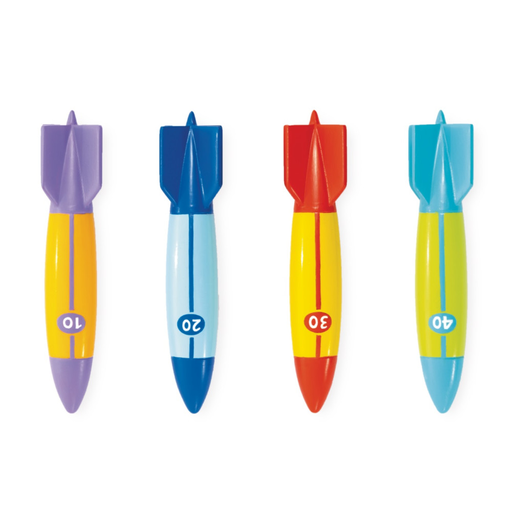 Dobd fel a medencés játékokat ezekkel a víz alatti torpedókkal, amelyek látványosan siklanak a víz alatt. A 3 × 3 × 12 cm-es torpedók élénk színekben készülnek, így könnyen észrevehetők merülés közben. Puha, rugalmas külső borításuk biztonságos használatot garantál, míg a kemény középső markolat pontos indítást tesz lehetővé. Akár 6 méter mélyen is stabilan haladnak a vízben.