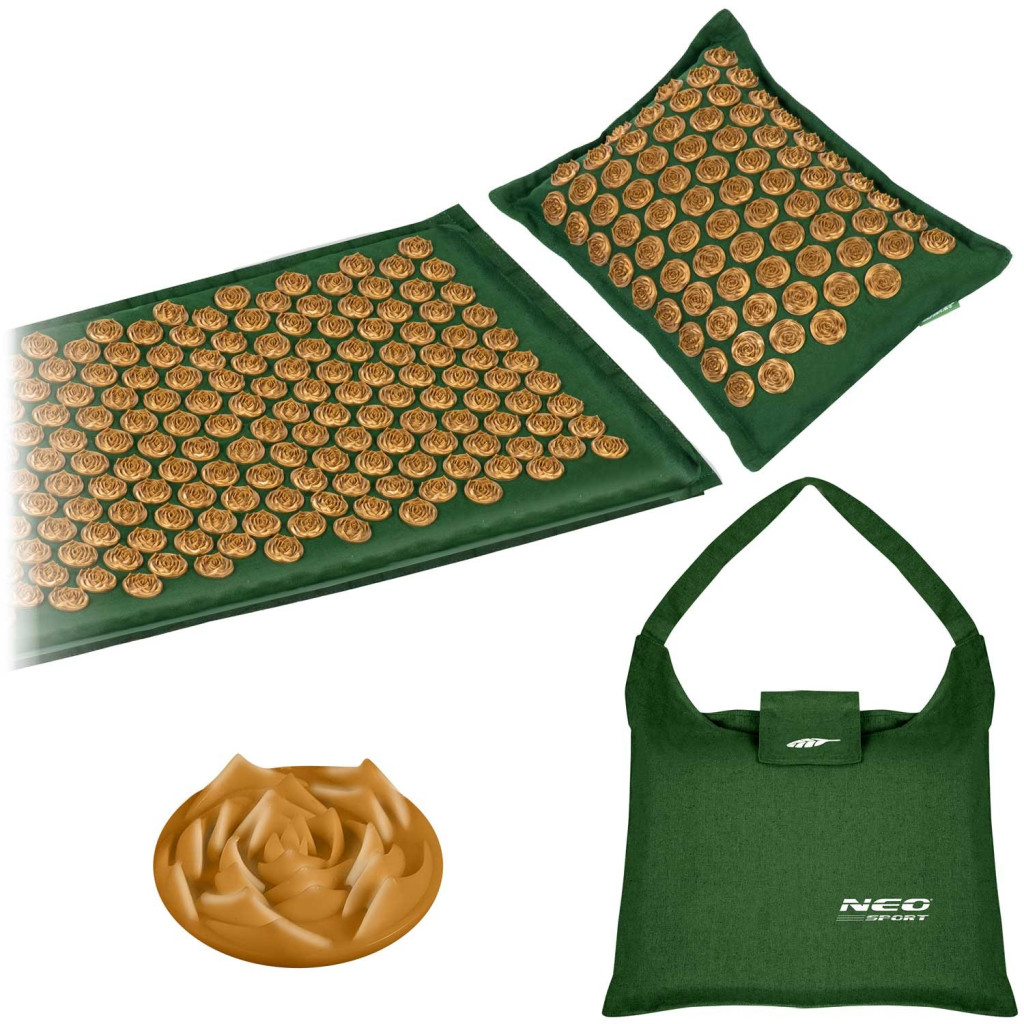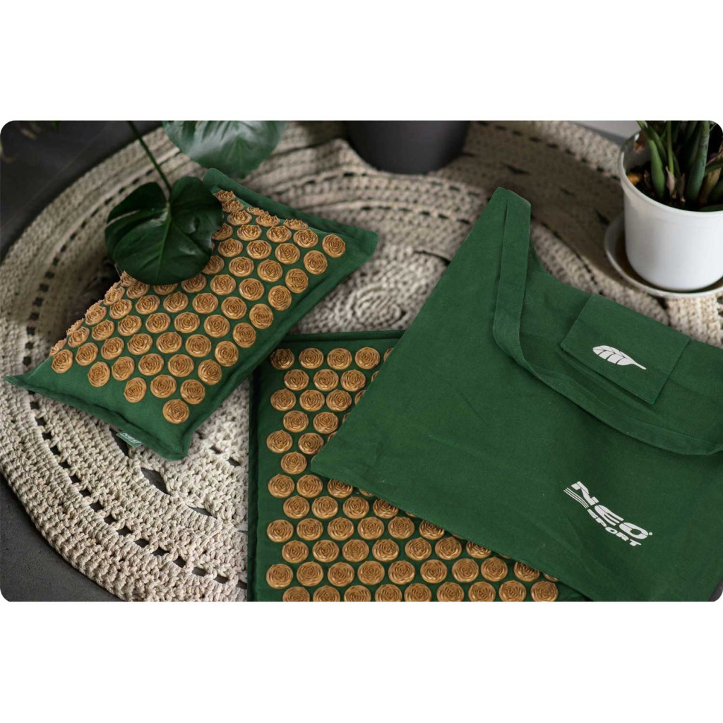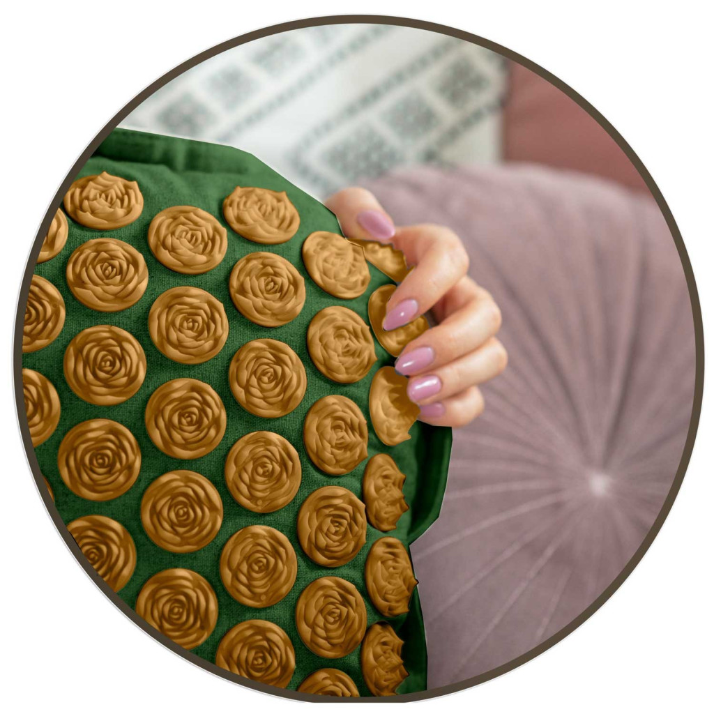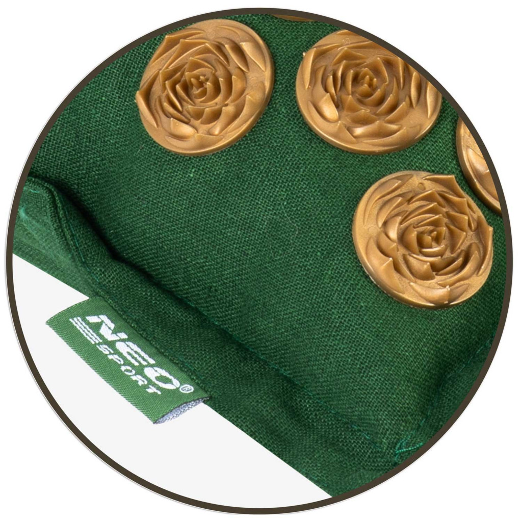 Éld át a pontmasszázs erejét az akupresszúrás szőnyeg NS-902 zöld–arany készlettel! A 70×44 cm-es szőnyegen 181 rózsaformájú tüske, a 30×44 cm-es párnán pedig 76 extra nyomópont ébreszti fel tested energiáját. A kókuszrost töltet rugalmas tartást ad, a levehető vászon–len huzat pedig gyengéd a bőrhöz. A mindössze 1,8 kg-os, elegáns hordtáskában bárhová magaddal viheted, és pár perc alatt felfrissülhetsz.