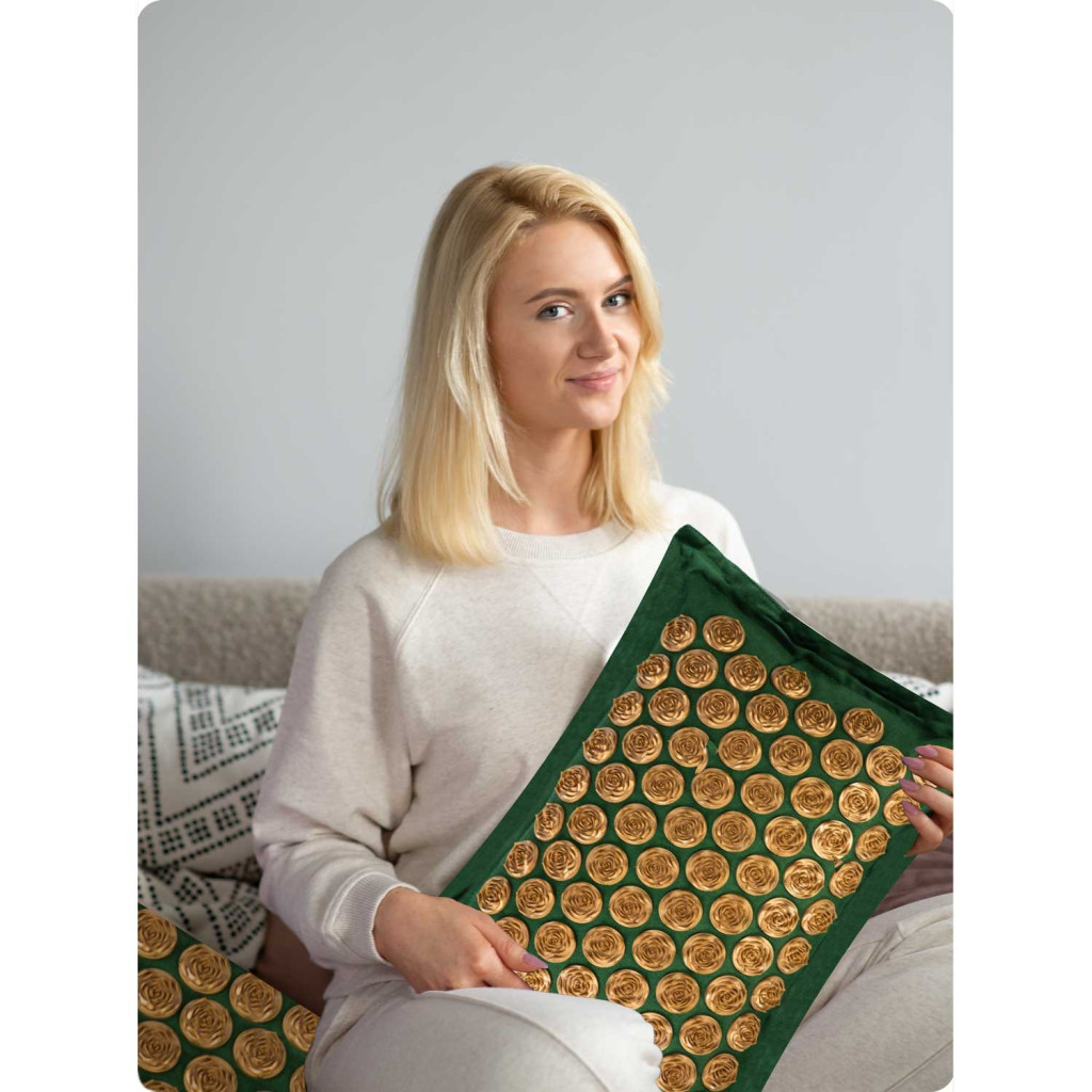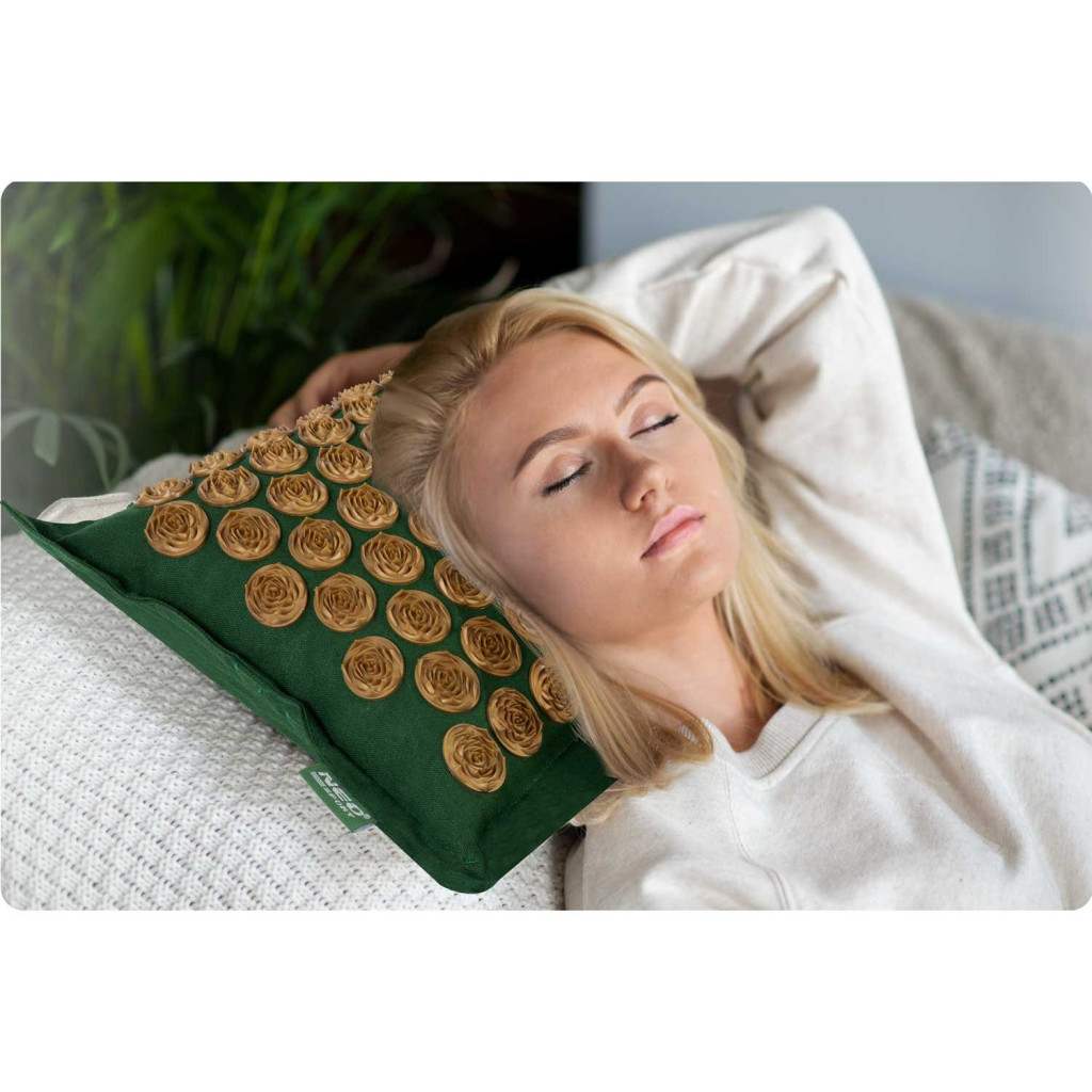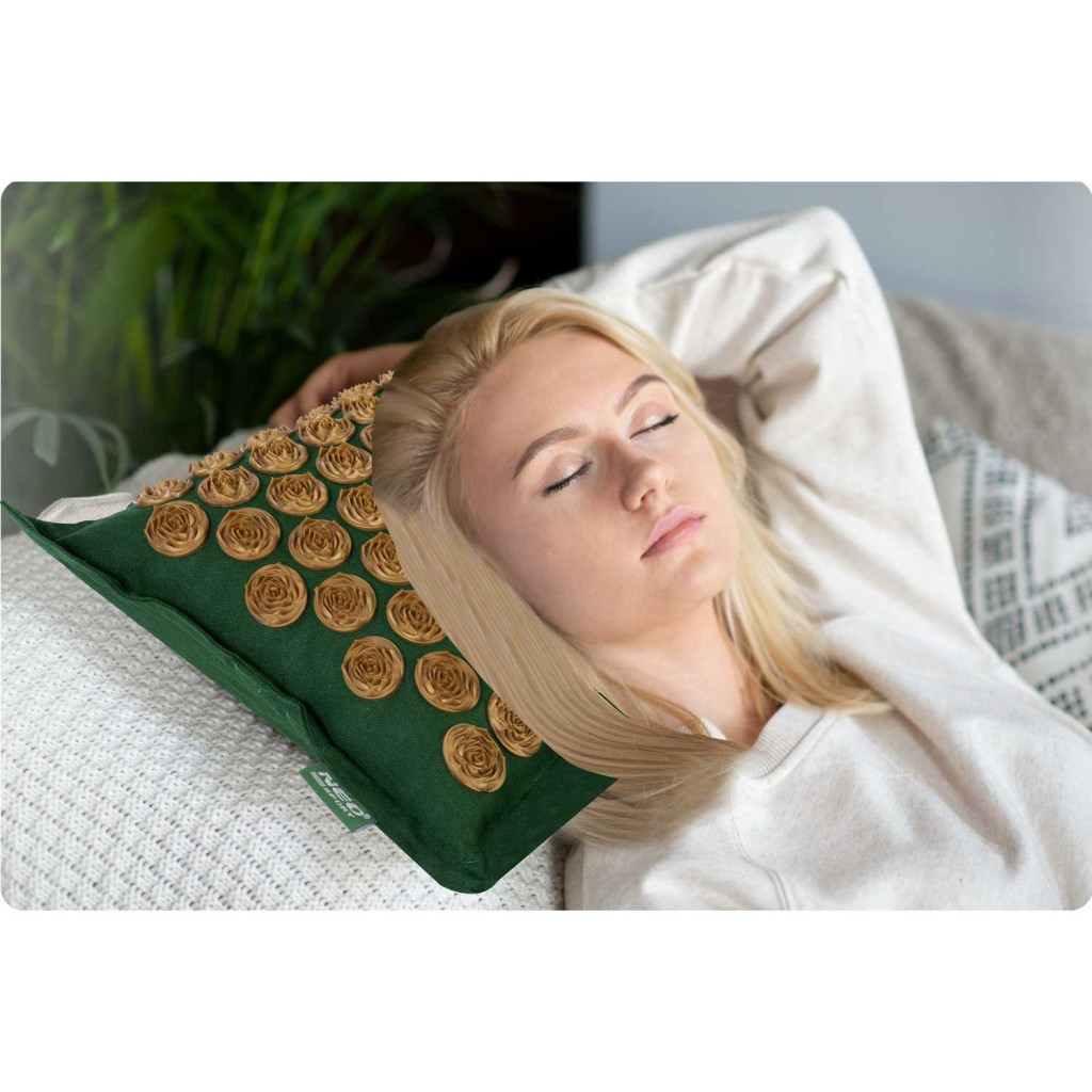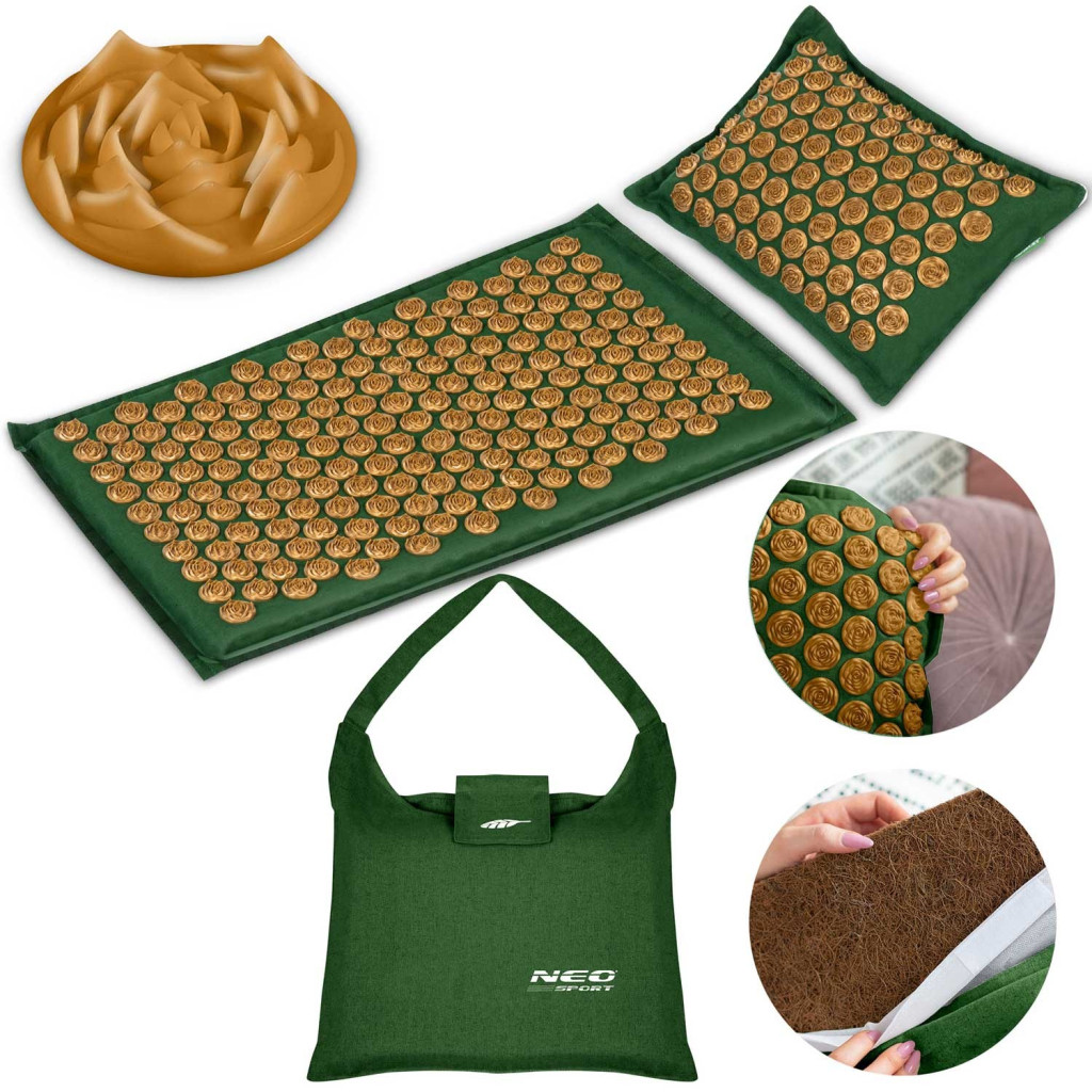 Éld át a pontmasszázs erejét az akupresszúrás szőnyeg NS-902 zöld–arany készlettel! A 70×44 cm-es szőnyegen 181 rózsaformájú tüske, a 30×44 cm-es párnán pedig 76 extra nyomópont ébreszti fel tested energiáját. A kókuszrost töltet rugalmas tartást ad, a levehető vászon–len huzat pedig gyengéd a bőrhöz. A mindössze 1,8 kg-os, elegáns hordtáskában bárhová magaddal viheted, és pár perc alatt felfrissülhetsz.