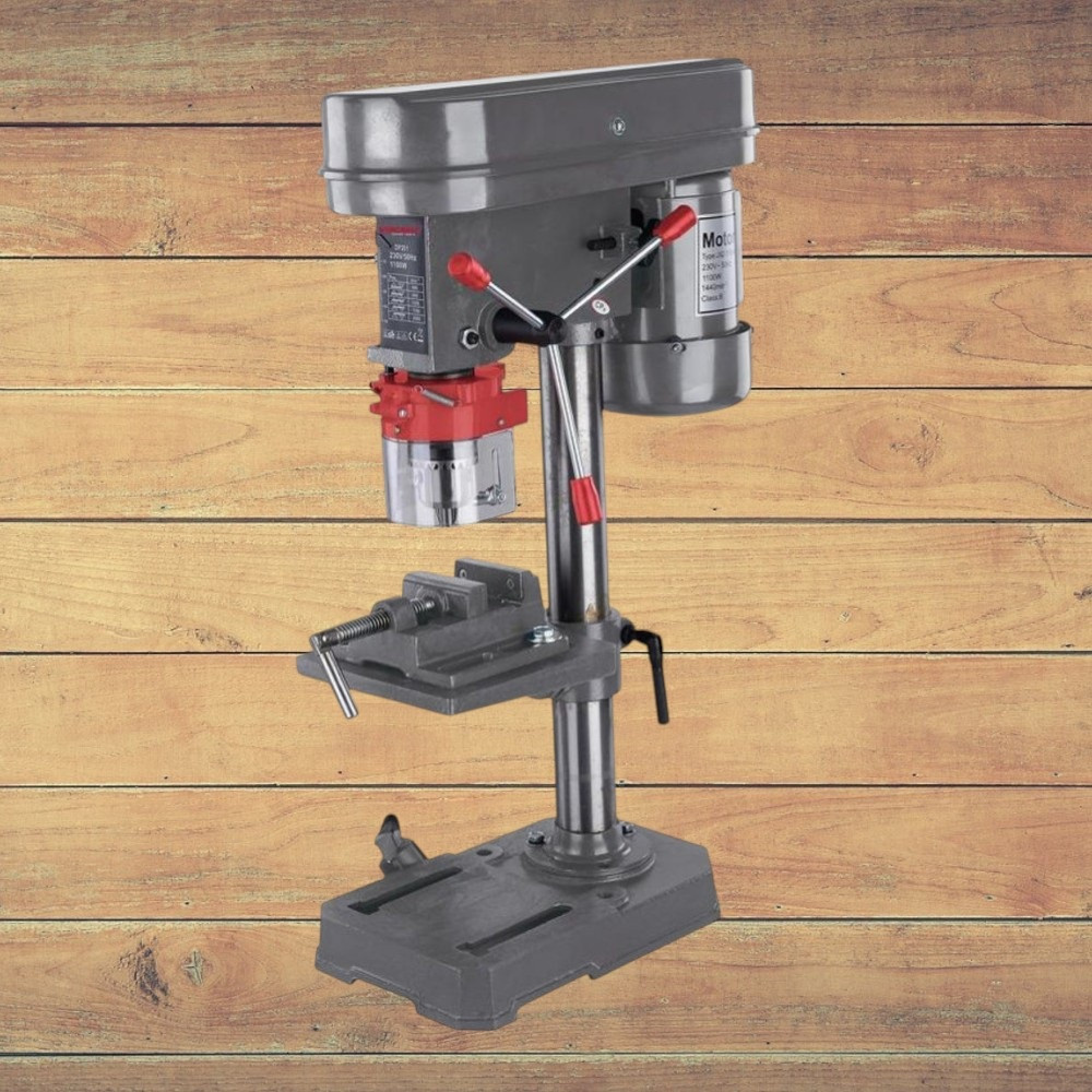 A Worcraft DP03-13 állványos fúrógép 350 W-os motorral és öntvény vázzal megbízható társ minden barkács- és profi műhelyben. Öt fordulatszintje 580–2650 ford./perc között mozog, így fához, fémhez vagy műanyaghoz is ideális. A 13 mm-es kulcsos tokmány számos szárat fogad, a 160 × 160 mm-es dönthető asztal és a mellékelt satupad pedig precíz rögzítést ad. Mélységskála, átlátszó védőburkolat és a 17 kg-os talp gondoskodik a biztonságos, rezgésmentes munkáról.