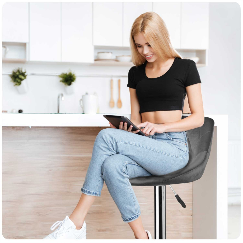 A modern, minimalista enteriőrök kedvenc darabja lehet, hiszen csiszolt króm talpa letisztult fényt, a grafitszürke bársony meleg textúrát visz a térbe. Gázrugós mechanikájával pillanatok alatt beállíthatod az ideális ülésmagasságot, így akár a reggeli kávézáshoz, akár egy esti koktélhoz tökéletes. A párnázott háttámla megtámasztja a derekat, a körkörös lábtámasz pedig tehermentesíti a lábakat, így hosszabb beszélgetések alatt is kényelmes marad.