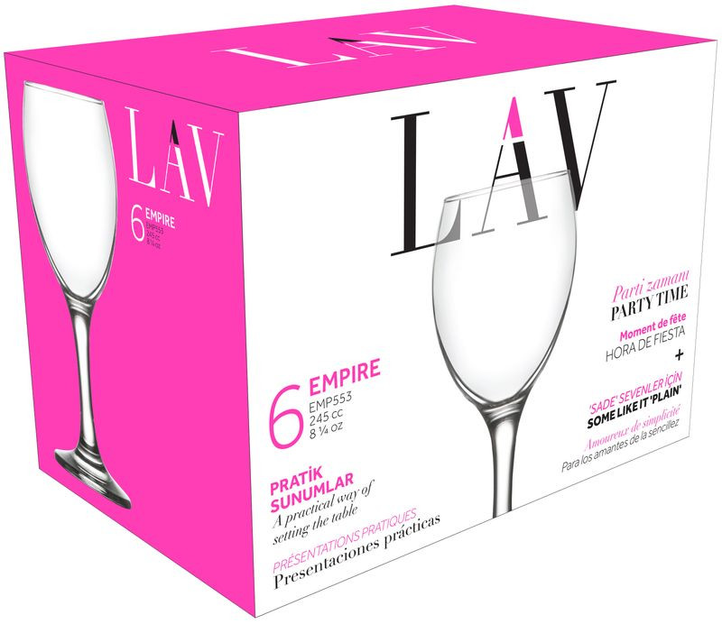 Éld át a borozás valódi eleganciáját a LAV Empire száras pohárkészlettel! A klasszikus, finoman ívelt kehely 245 ml-es űrtartalommal tökéletesen kiemeli a vörös és fehér borok aromáit. A 63 mm-es átmérő és a 169 mm-es magasság kényelmes fogást és stabil tartást biztosít, a masszív üvegszerkezet pedig ellenáll a napi igénybevételnek. A hatdarabos szett ideális családi vacsorákhoz, baráti borkóstolókhoz és elegáns ünnepi terítékhez is.