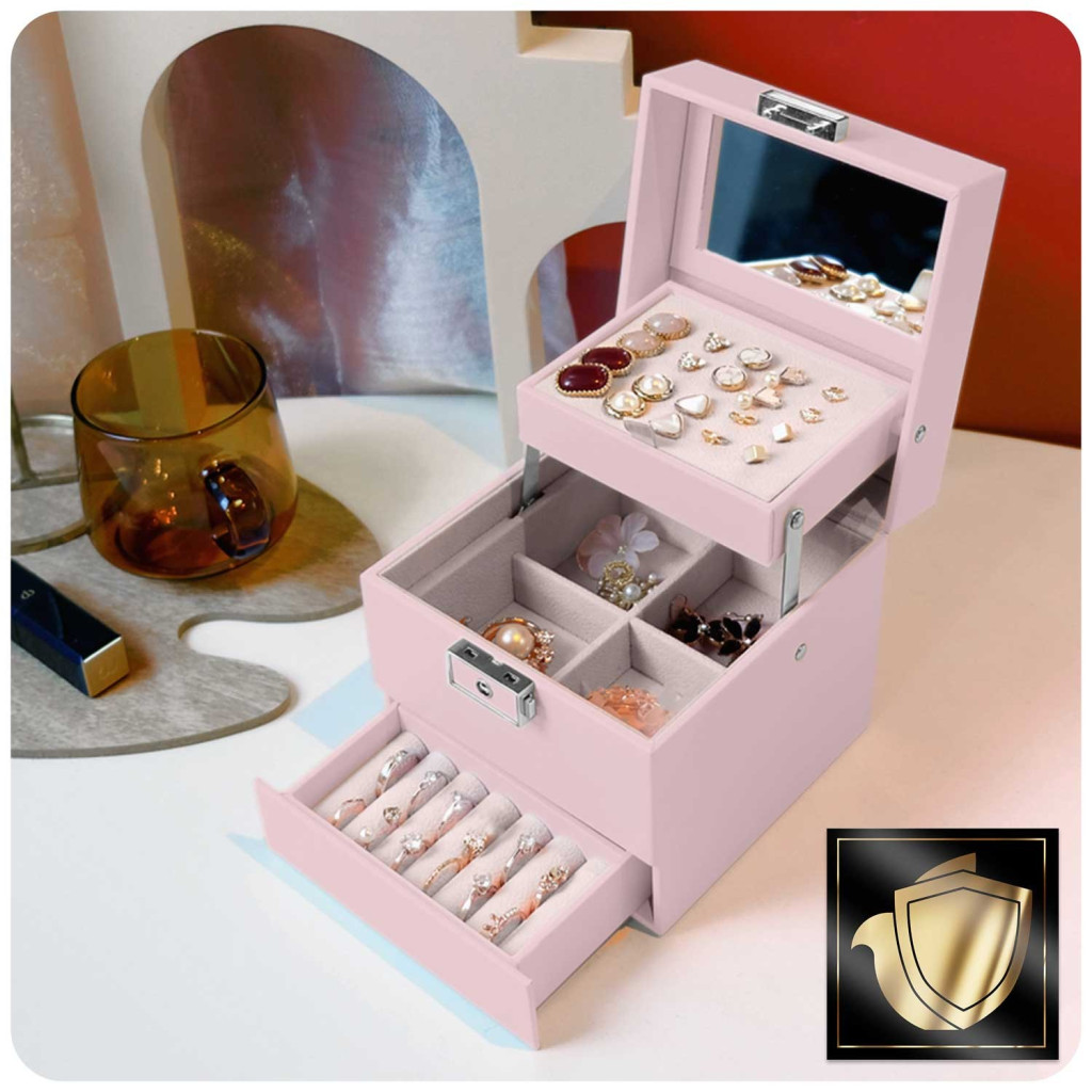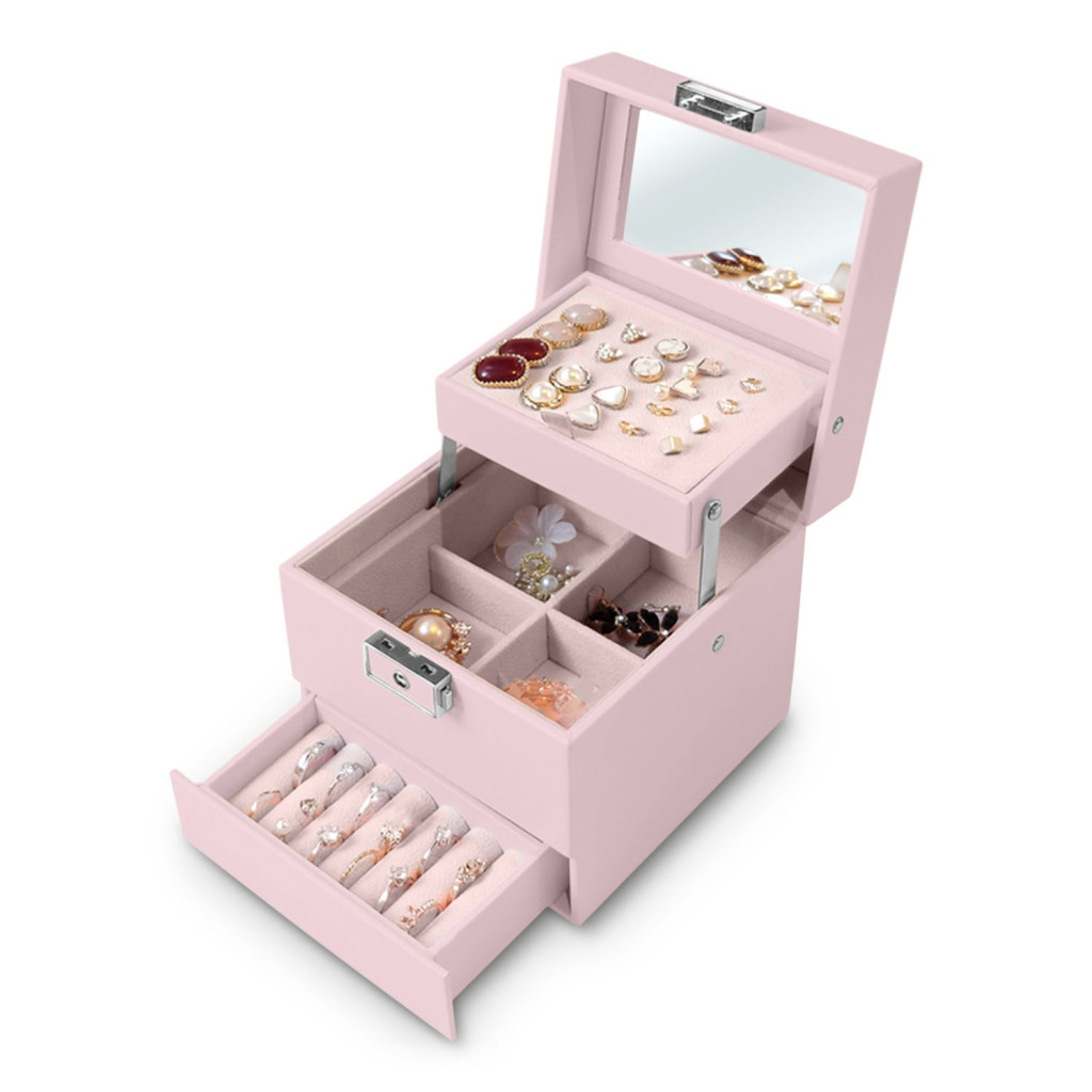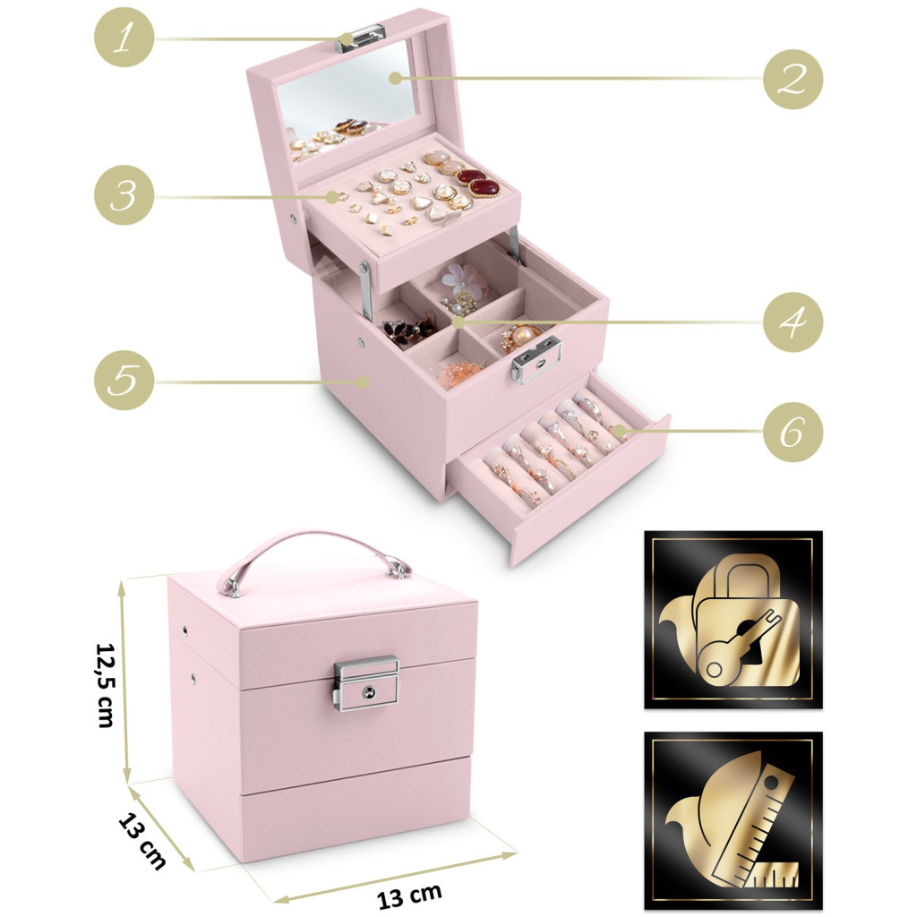 A Massido MS-703 rózsaszín ékszerdoboz egy elegáns, kocka formájú mini szekrény, amely 13 x 13 x 12,5 cm-es méretével egyszerre diszkrét és meglepően tágas. Prémium PU bőrutánzat borítása kopásálló, selymes tapintású, belsejét puha velúr borítás óvja az ékszereket. A felnyitható fedélen praktikus tükör és perforált fülbevalótartó lap fogad, alatta több variálható rekesz, gyűrűpárnázott fiók, valamint erős fémbetétes zár és kulcs gondoskodik az értékek biztonságáról.