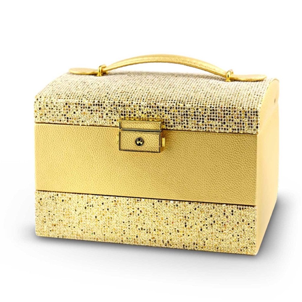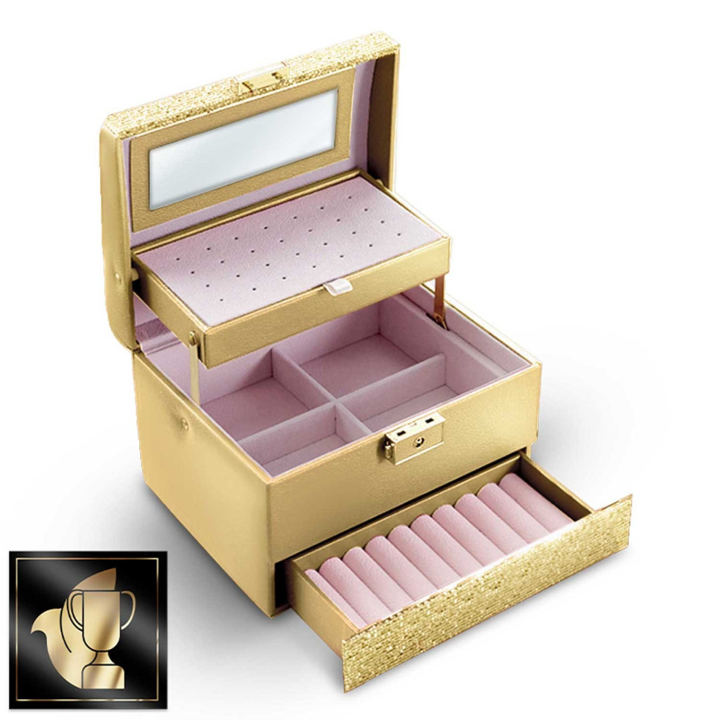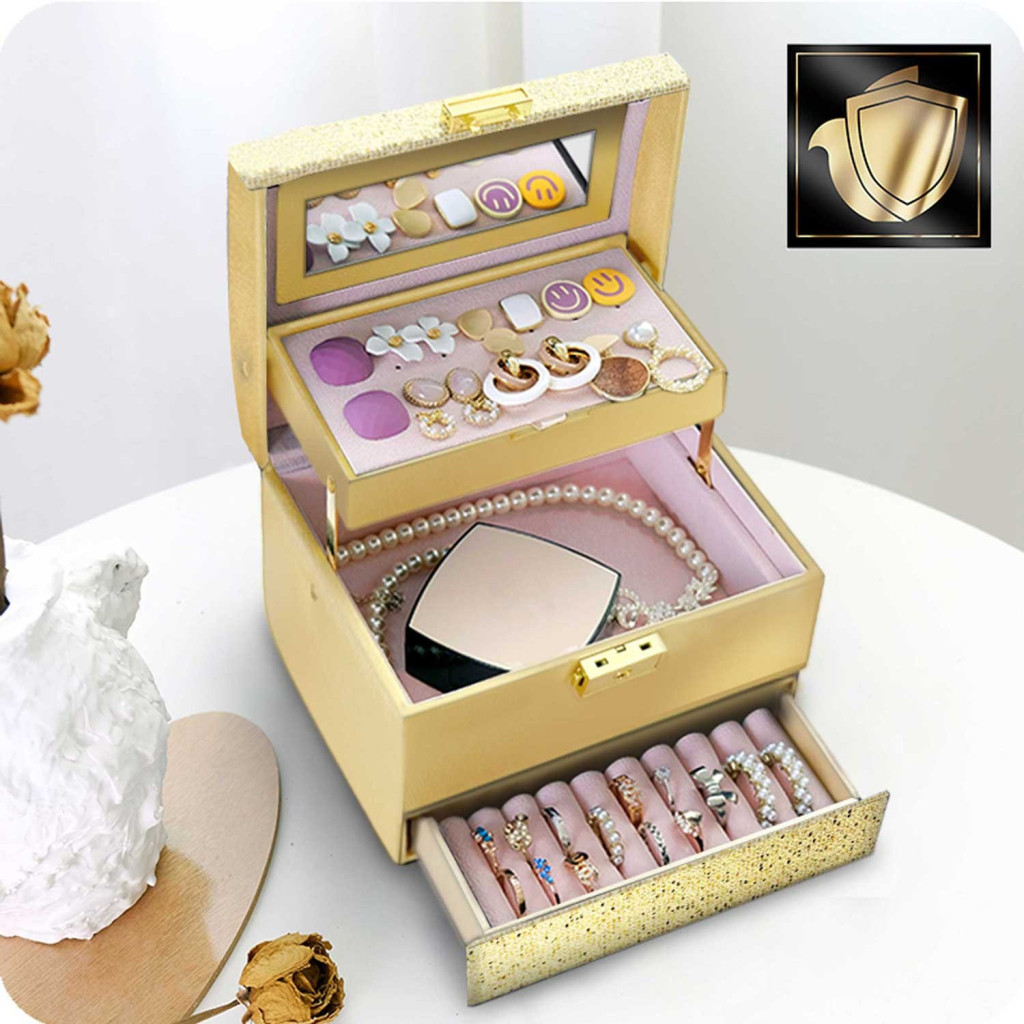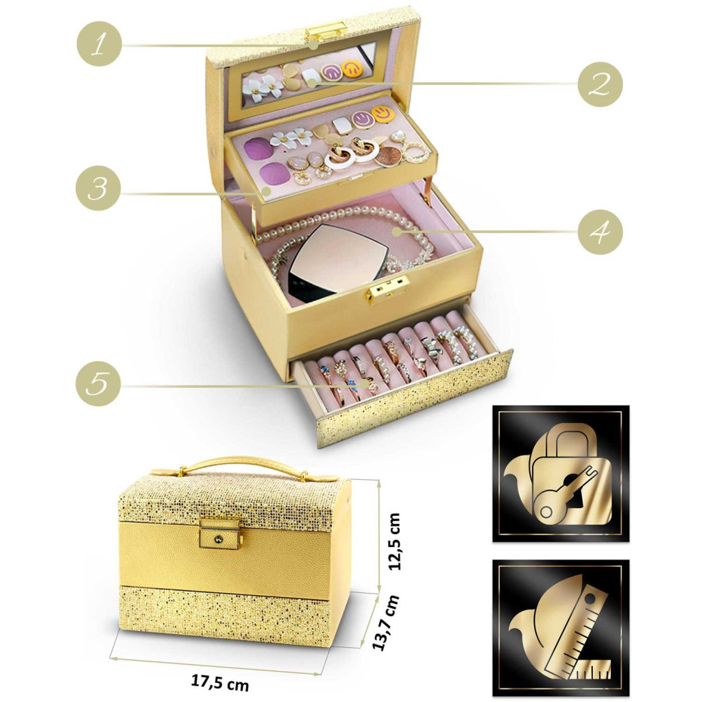 Moduláris belső elrendezése rugalmasan igazodik az igényeidhez: a perforált tálca gondoskodik a fülbevalókról, a négyrekeszes fő tér elválasztói egyszerűen kivehetők, a fiókban pedig gyűrűid sorakozhatnak rendezetten. A masszív fémzár védi a tartalmat, a csillogó arany dizájn pedig önmagában is dísze az öltözőasztalnak – ajándéknak és saját használatra egyaránt tökéletes.