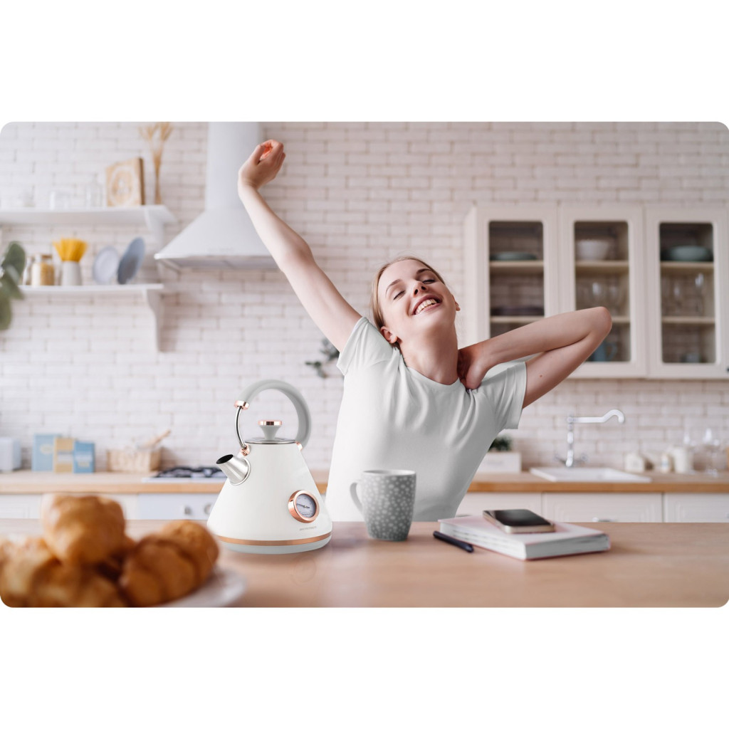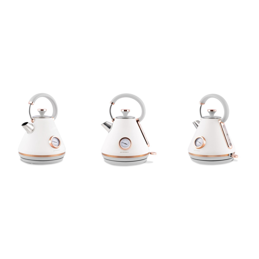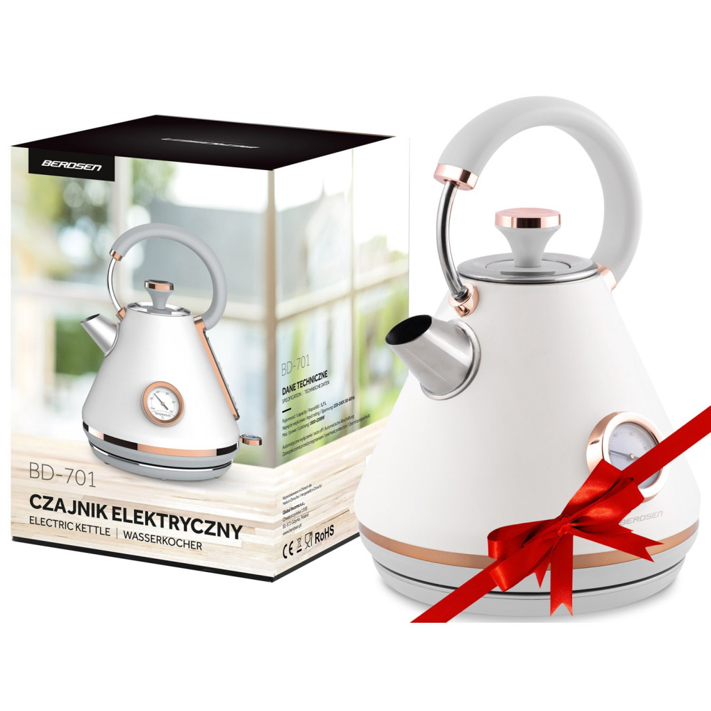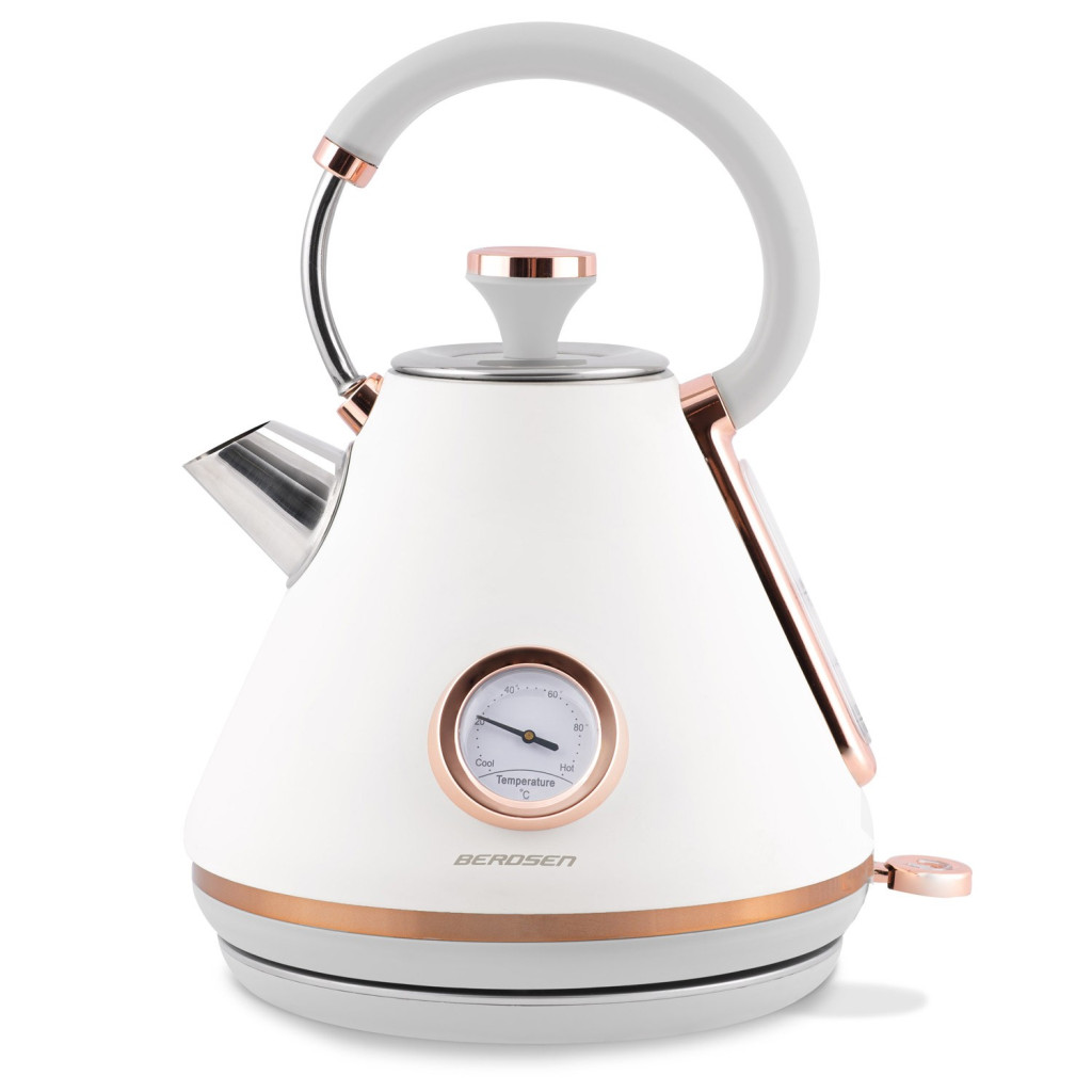Elegáns, retro hangulatú társad a mindennapi teázáshoz a Berdsen BD-701 1,7 literes elektromos vízforraló. Kúpos fémháza matt törtfehér árnyalatú, finom rózsaarany betétekkel, így bármely fehér, bézs vagy szürke konyhapulton vonzza a tekintetet. A beépített analóg hőmérővel könnyedén eltalálod a tökéletes hőfokot a kávéhoz, teához vagy babatápszerhez. Az erős, 1850–2200 W-os fűtőszál pillanatok alatt felforral akár 1,7 liter vizet, a 360°-ban forgatható talp pedig bal- és jobbkezes használók számára egyaránt kényelmes.