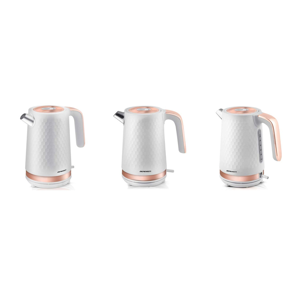 A Berdsen BD-705 elektromos vízforraló 1,7 literes űrtartalmával pillanatok alatt felforralja a vizet, miközben matt fehér fémteste elegánsan díszíti a konyhapultot. A rézszínű gyűrű és fedél modern, mégis visszafogott látványt nyújt. A 1850–2200 W teljesítményű fűtőelem gyors melegítést biztosít, a kivehető vízkőszűrő pedig óvja az italok tisztaságát. A 360°-ban forgatható talp, a hűvös maradó fogantyú és a leemelhető fedél kényelmessé teszi a mindennapos használatot.