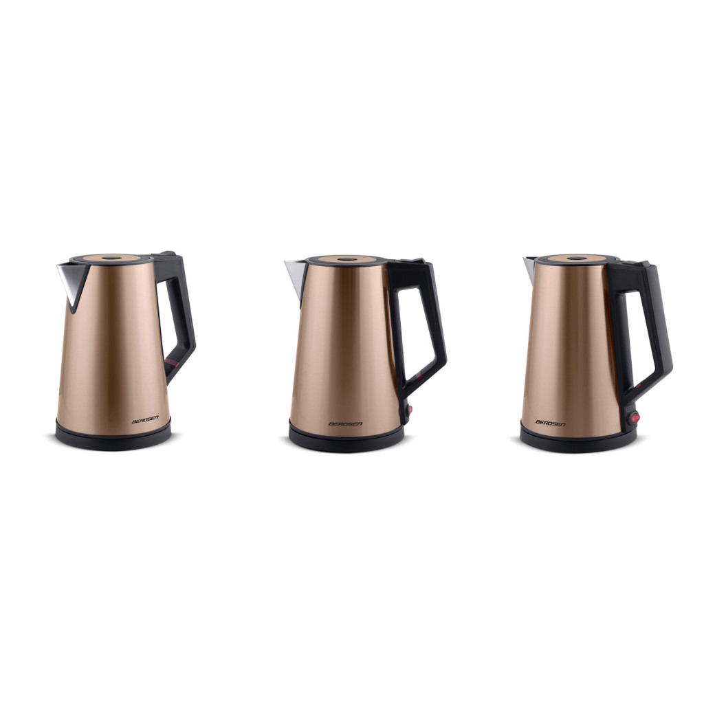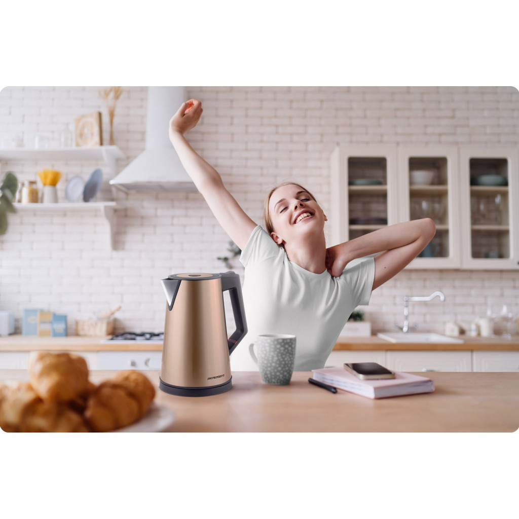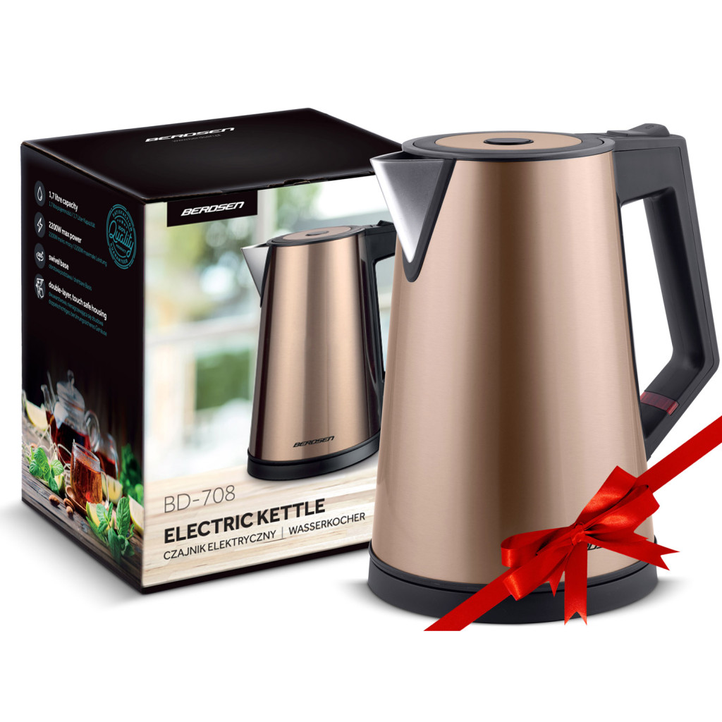 A Berdsen BD-708 elektromos vízforraló 1,7 literes kapacitásával és elegáns rézarany borításával azonnal a konyha díszévé válik. Kétrétegű, hőszigetelt fala megakadályozza a külső felmelegedést, így biztonságos a használata. A 304-es rozsdamentes acél belső felület tiszta, ízmentes vizet biztosít, míg a 1850–2200 W teljesítménynek köszönhetően pillanatok alatt felforralja a szükséges mennyiséget. A 360°-ban forgatható talp, a csúszásmentes lábak és a beépített, szárazonfutás elleni védelem tovább növelik a kényelmet.