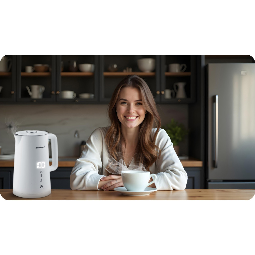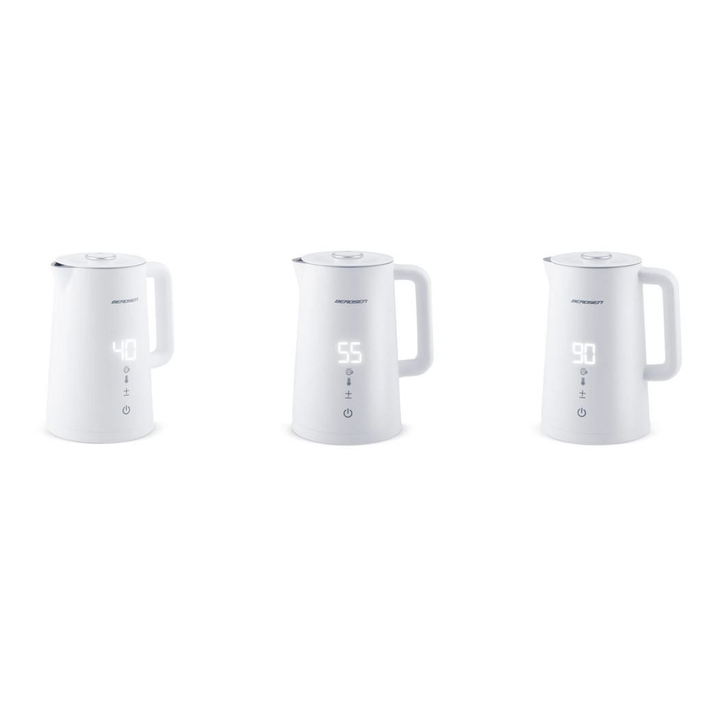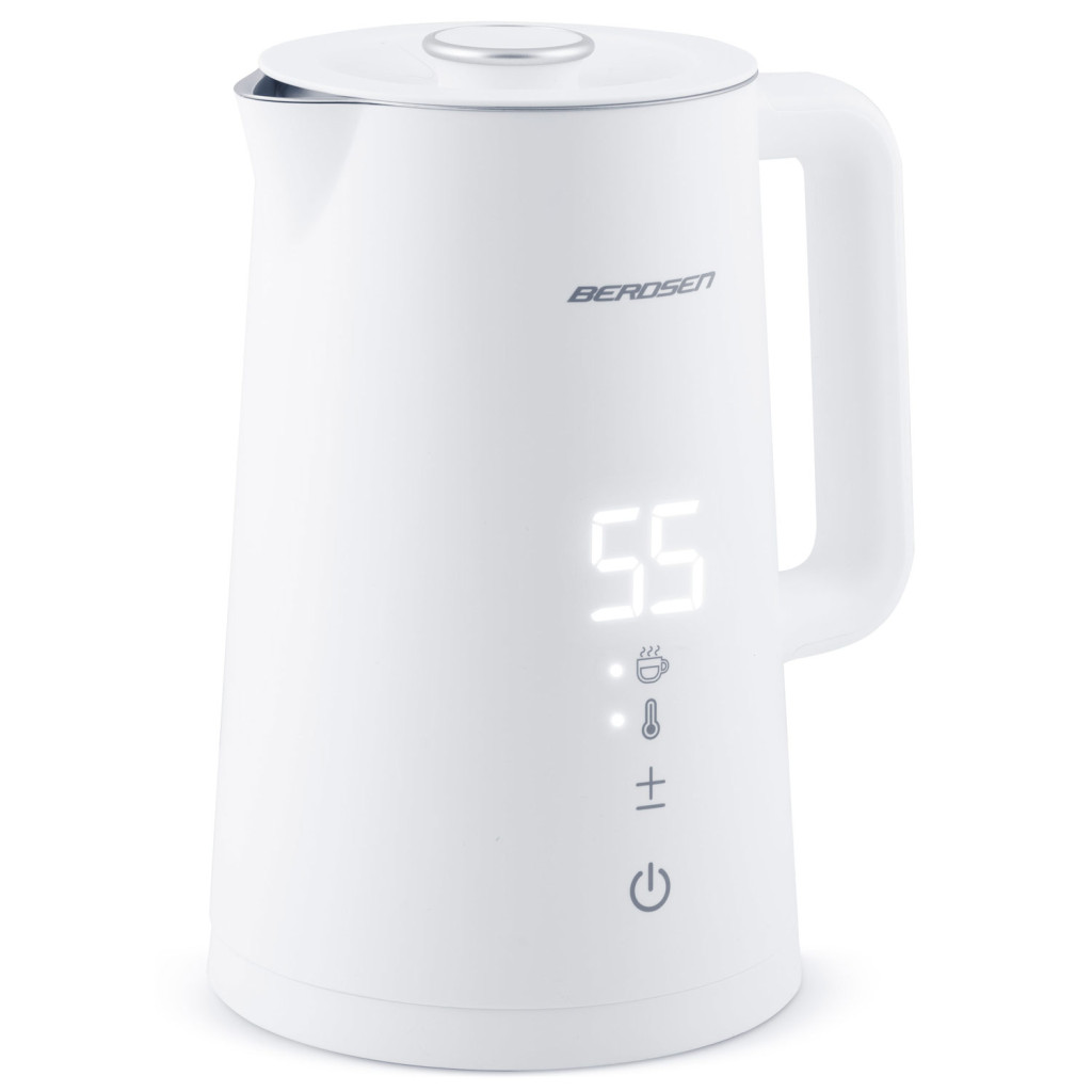 Élvezd a precíz hőszabályozás kényelmét a Berdsen BD-709 1,7 literes elektromos vízforralóval! A dupla falú CoolTouch burkolat hidegen marad, miközben a belső rozsdamentes acél gyorsan és tisztán forralja a vizet. Érintőpaneles LED-kijelzőjén öt választható hőfok (40-55-80-90-100 °C) jelenik meg, a kétórás hőtartó funkció pedig mindig ideális hőmérsékletet biztosít teádhoz, kávédhoz vagy a baba italához.
