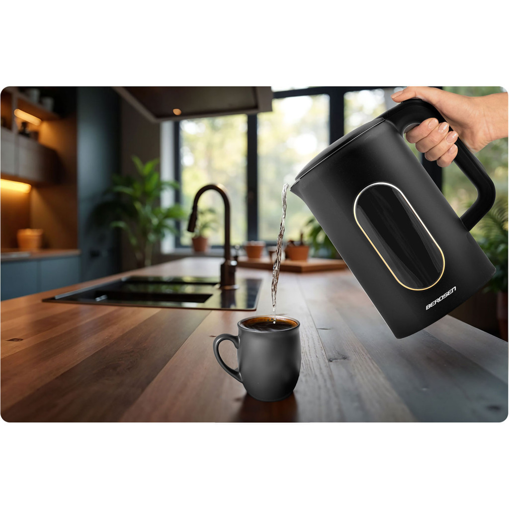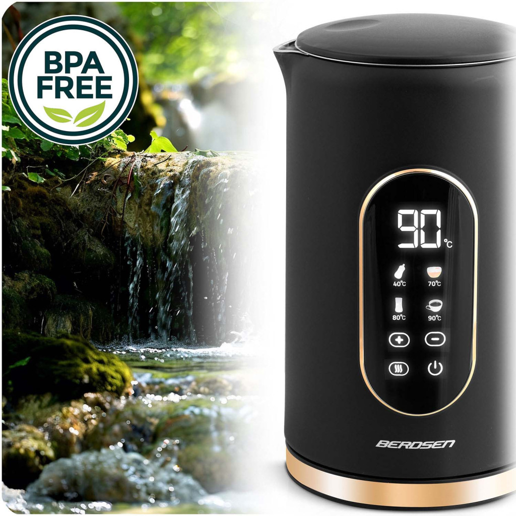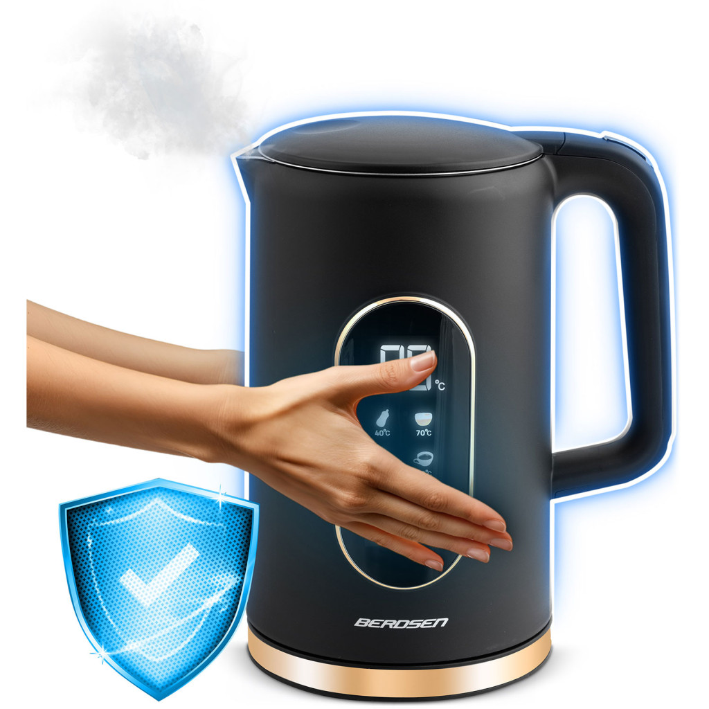 Élvezd a modern kényeztetést a Berdsen BD-712 elektromos vízforralóval! Az elegáns fekete–arany burkolat alatt 1,7 literes kapacitás, 2200 W teljesítmény és intelligens érintőkijelző rejtőzik. Válaszd ki az 40, 70, 80, 90 vagy 100 °C programot, vagy lépkedj 5 °C-onként a tökéletes italhőmérsékletért, a készülék pedig akár 2 órán át tartja is. A kétrétegű CoolTouch™ ház nem melegszik fel, a cseppmentes kiöntő pedig tiszta konyhapultot garantál.