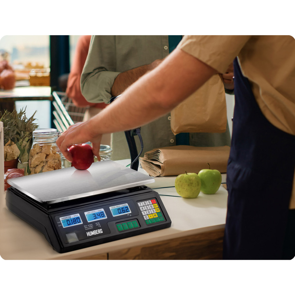 A Humberg MH-190 elektronikus bolti mérleg megbízható társ minden zöldséges, hentes vagy piaci stand számára. A robusztus, fekete házban rejlő precíziós szenzorok akár 40 kg-ig mérnek, 2 g-os lépésközzel, így a friss gyümölcstől a nagyobb húskészítményekig mindent pontosan kimérhetsz. A rozsdamentes acél mérőlap higiénikus és könnyen tisztítható, a három háttérvilágított kijelzőn pedig egyszerre látható a súly, az egységár és a végösszeg, ami gyorsítja a kiszolgálást.
