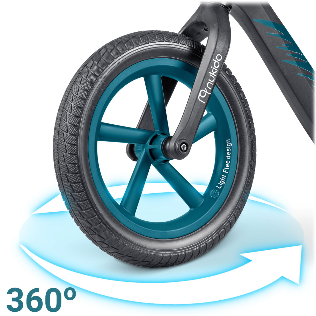 Nyerj lendületet a Nukido Light Flee futóbiciklivel, amely ideális első lépés a pedálos kerékpározás felé! A strapabíró, de ultrakönnyű – mindössze 2,8 kg-os – nylon vázat a 12”-os, defektmentes EVA kerekek egészítik ki, így a kicsik gondtalanul száguldhatnak akár parkban, akár a járdán. Az ergonomikus, habszivacs ülés 35–41 cm között állítható, a csúszásmentes, stopperes markolat pedig biztos fogást garantál. A 360°-ban forduló első villa játékosan fordulékony, hogy a felfedezés tényleg határtalan legyen.