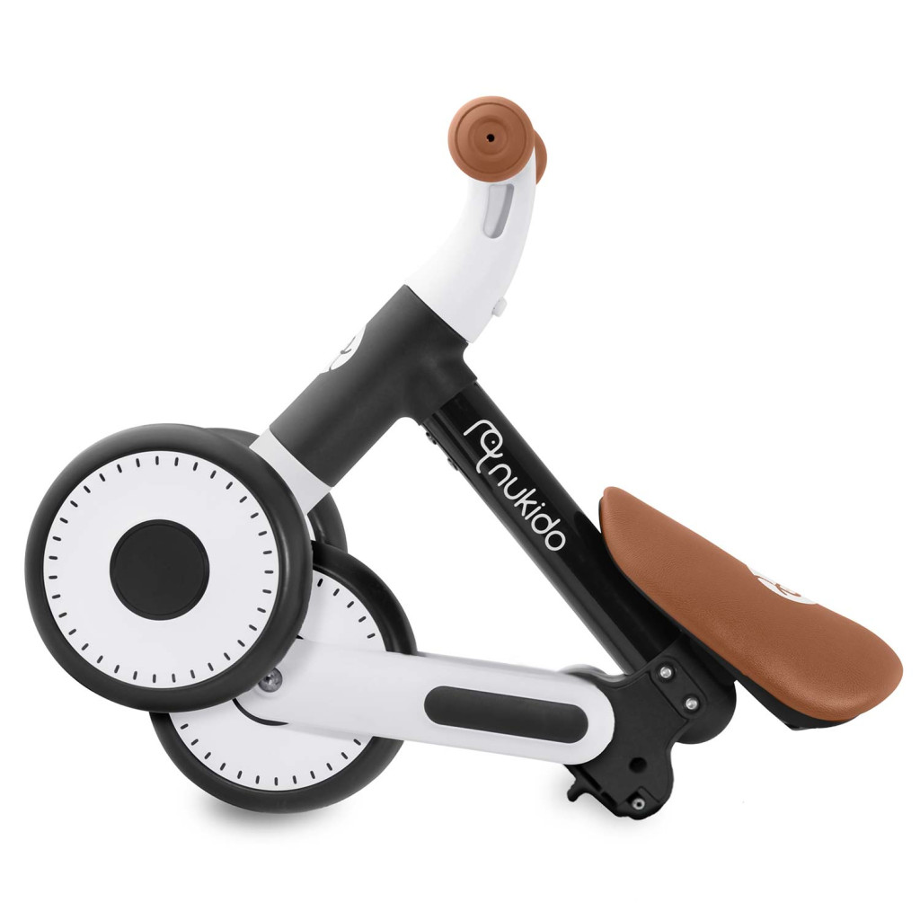 A Nukido NK-603 futóbicikli a legkisebbek számára tervezett, ultrakönnyű (mindössze 2,3 kg) tanulójárgány. Három, 15 cm átmérőjű, defektmentes EVA habkerekével gondoskodik a maximális stabilitásról, míg az acél váz strapabíró, mégis kecses. A karamellszínű, párnázott nyereg 25–28 cm között állítható, így a bicikli együtt nő a gyerkőccel. A biztonsági kormányszög-határoló megelőzi a hirtelen fordulásokat, a gumírozott markolatok pedig óvják a pici kezeket.