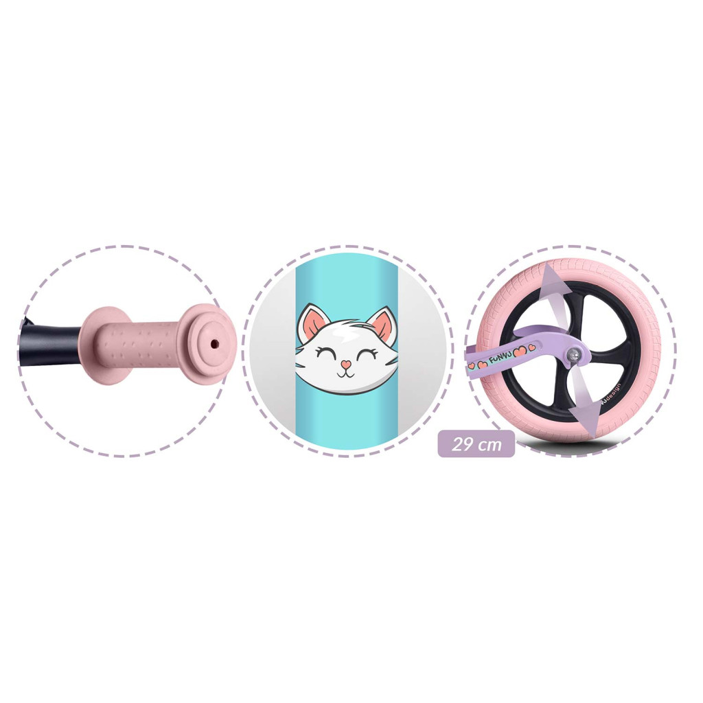 A Ricokids FUNNU futóbicikli minden kis felfedező álma: mindössze 3,7 kg-os ultrakönnyű, magnézium vázzal, így a gyerekek könnyedén irányíthatják, a szülők pedig gond nélkül felkaphatják utazáskor. A 12-es (29 cm) EVA habkerekek sosem lyukadnak ki, legyen szó parkról, homokról vagy városi járdáról. Az ergonomikus, 35–42 cm között állítható, puha ülés hosszú ideig együtt nő a kicsikkel, a csúszásmentes, rózsaszín markolatstopperek pedig extra biztonságot nyújtanak.