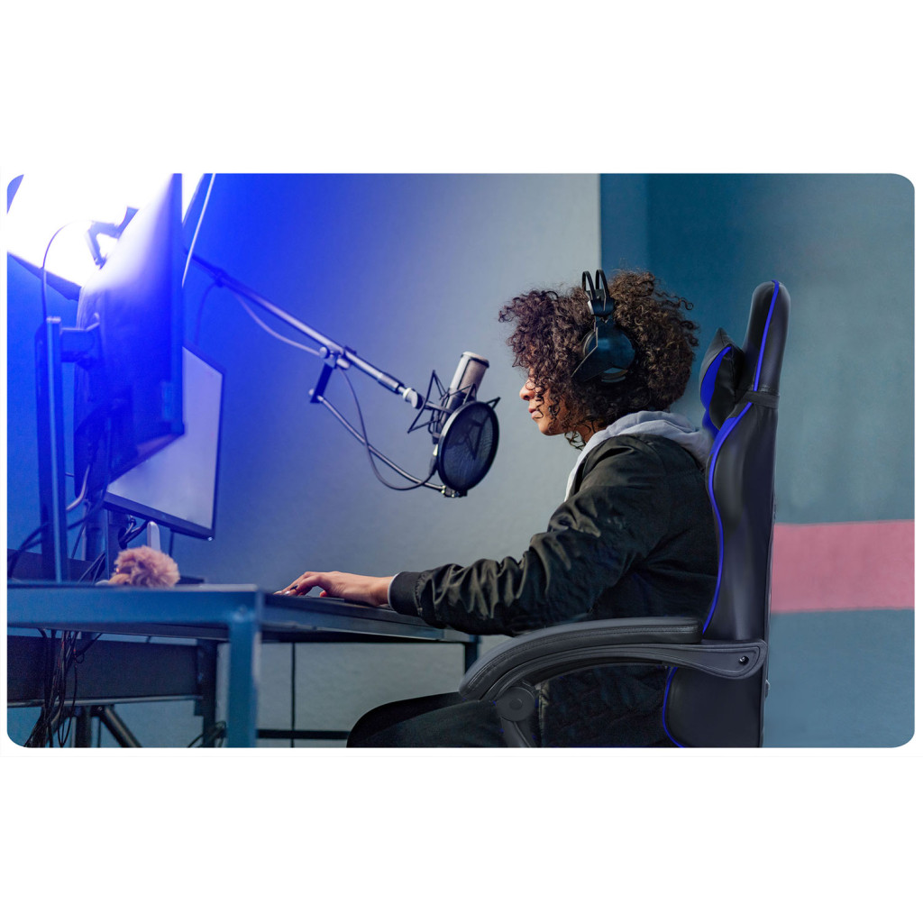 A Sofotel Draknor gamer fotel fekete-kék színben igazi trón, amelyet kimondottan hosszú játékmenetekhez terveztek. Versenyülésre emlékeztető, kontúros háttámlája stabilan támasztja a gerincet, miközben a vastag, nagy sűrűségű szivacspárnázás maximális komfortot nyújt. A strapabíró műbőr borítás könnyen tisztítható, a gázliftes magasságállítás és a hintamechanika pedig személyre szabható kényelmet garantál akár több órányi gaming, streamelés vagy munkavégzés során.