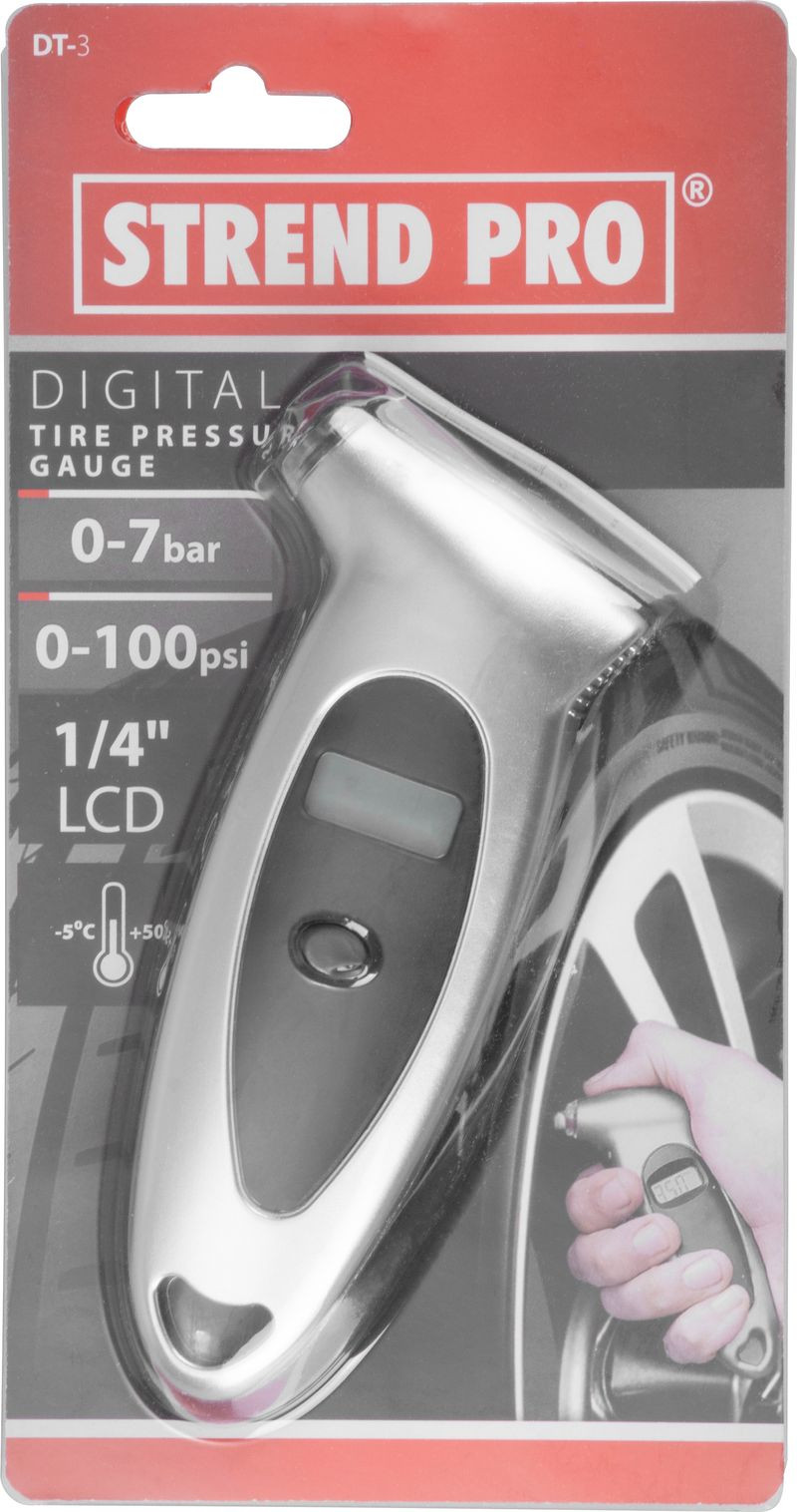 Az Airtool DT-3 digitális gumiabroncsnyomás-mérővel pontosan és pillanatok alatt ellenőrizheted autód, motorod vagy kerékpárod abroncsainak nyomását. A kompakt, mindössze 120 grammos eszköz ezüst–fekete háza kényelmes fogást biztosít, döntött fejének köszönhetően pedig könnyedén illeszkedik a szelephez. A beépített lítium gombelem hosszan tartó energiáról gondoskodik, míg a háttérvilágított kijelző akár sötétben is jól olvasható értékeket mutat 5–99 psi tartományban.