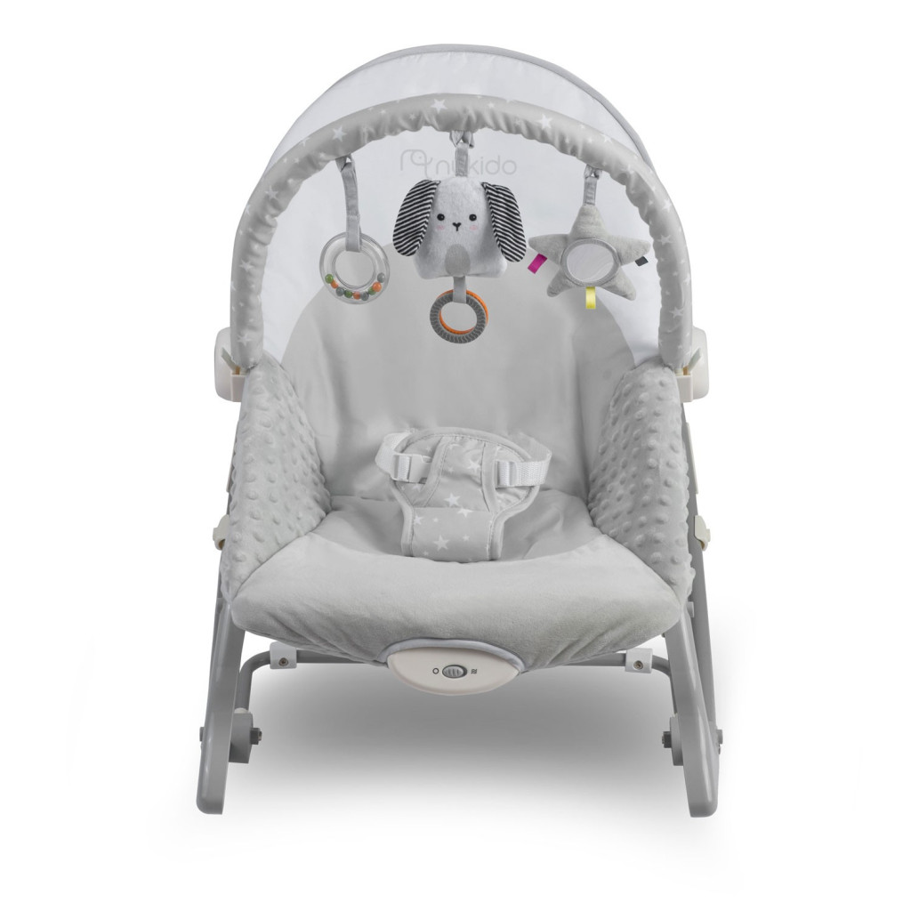 A Nukido rezgő pihenőszék kellemes, biztonságos kuckót teremt a picinek. A könnyű, 3,2 kg-os szerkezet stabil fémvázzal és finom, szürke plüsshuzattal készül, hogy a ringás élménye mellett lágy ölelésben tartsa a babát. A levehető játékív csillagos mintájú textillel borított, három kedves plüssjátékot rejt: kutyust, csillagot és csörgőkarikát, amelyek fejlesztik a látást és a tapintást. A beépített rezgő funkció megnyugtat, a puha, állítható öv pedig gondoskodik a biztonságról.