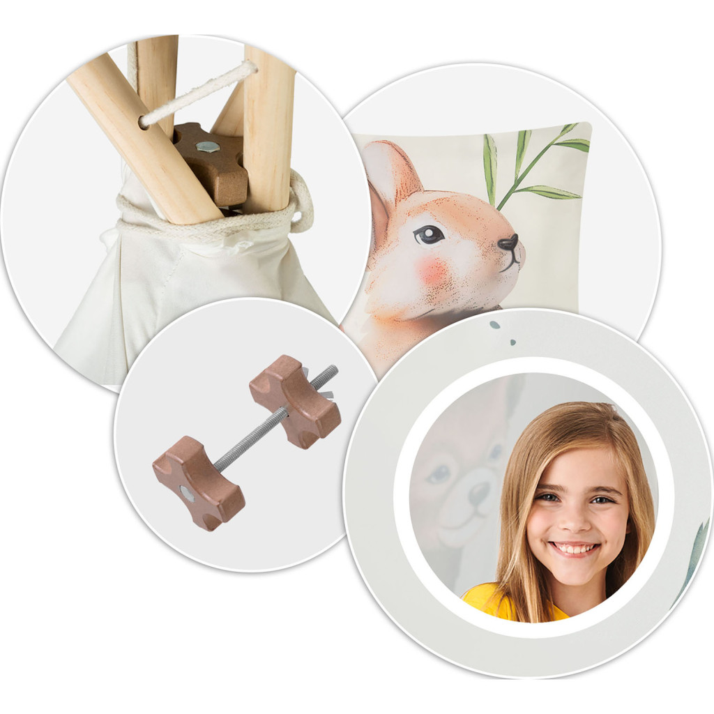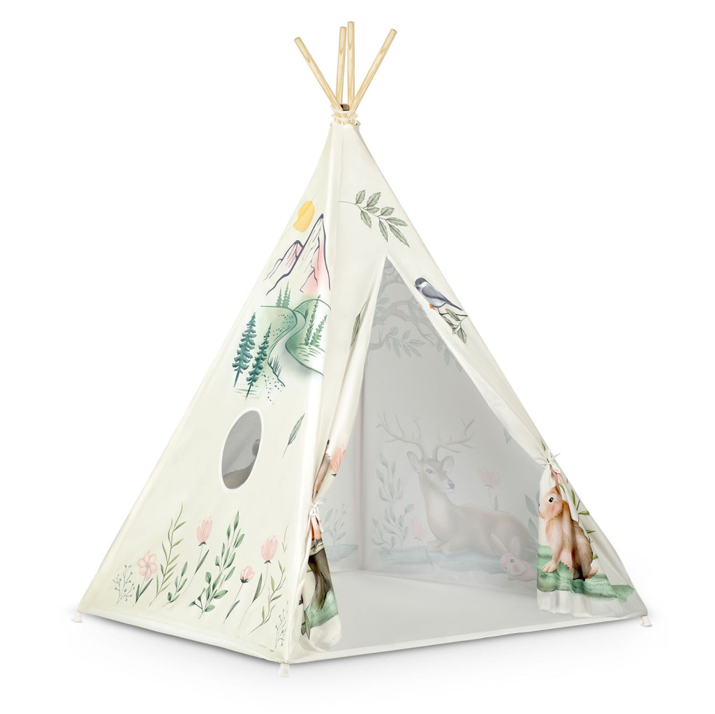 Nukido bézs tipi gyereksátorral saját kis kuckót teremthetsz a kicsinek, ahol biztonságban szárnyalhat a fantázia! A 114 × 114 × 165 cm-es sátor lélegző, prémium poliészterből készült, amely szellős, ugyanakkor formáját is megőrzi. A mosolygó nyuszit, őzet és madarakat ábrázoló pasztell grafikák barátságos, Montessori-inspirálta hangulatot varázsolnak a gyerekszobába. A 2025-ös fejlesztésű stabilizátor és a csúszásgátlós, erősített fenyőrudak extra biztonságot nyújtanak, míg a puha padló és a bónusz párna gondoskodik a kényelemről.