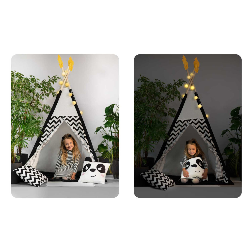 A letisztult fekete-fehér design bármely gyerekszobához illik, a Montessori-barát kialakítás pedig önálló, kreatív játékra ösztönöz. A sátor pillanatok alatt felállítható, összehajtva pedig kis helyen elfér, így akár a kertbe is átköltözhet egy napsütéses délutánra. A mellékelt meleg fényű fényfüzér és a színes girland igazi kuckóhangulatot teremt, amelyben még a mesék is izgalmasabbak.