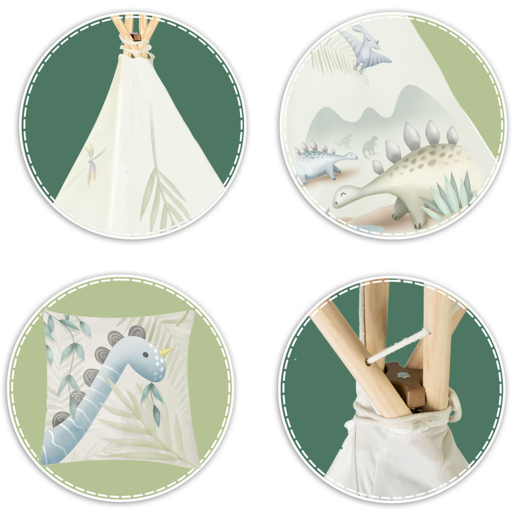 A Nukido dinoszauruszos tipi sátra igazi kalandbázissá varázsolja a gyerekszobát! A 114 × 114 × 165 cm-es méret kényelmes búvóhelyet nyújt, a 2,25 kg-os tömeg pedig megkönnyíti az áthelyezést. A magas grammitású, légáteresztő prémium poliészter falakhoz a padló egybe van varrva, így a szerkezet nem csúszkál játék közben. A négy, 1,8 cm átmérőjű és 187,5 cm hosszú fenyőfa rúd stabilitását egy mellékelt stabilizátor fokozza, a dínós párna pedig extra komfortot ad.