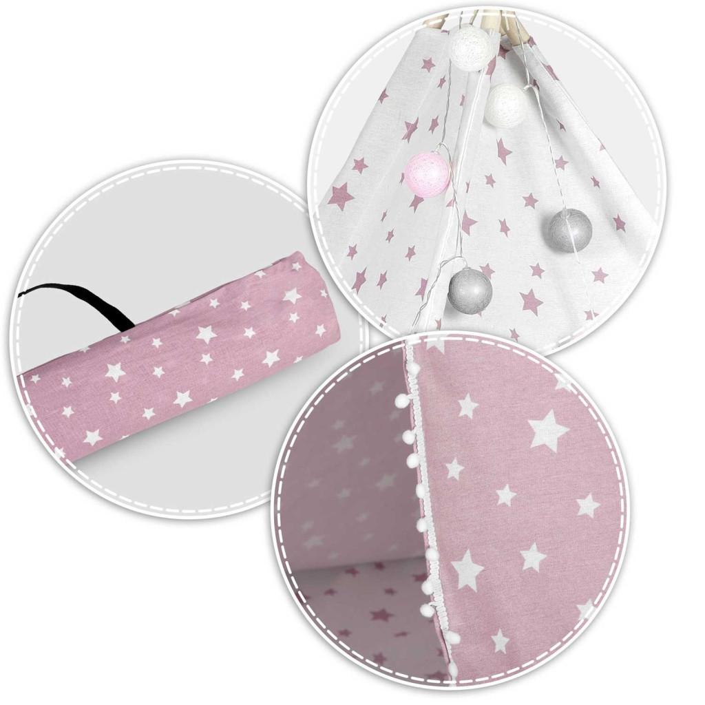 Alkoss mesés indián falut a gyerekszobában a Nukido rózsaszín, csillagmintás tipi sátrával! A 120×120×165 cm-es, prémium 175 g/m² pamutból készült sátor puha, lélegző és strapabíró, miközben a natúr fenyőfa rudak stabil vázat adnak. A csomagban három pufi párna, szigetelő matrac, hangulatos LED-füzér, stabilizátor és hordtáska is helyet kapott, így a kicsik kényelmes búvóhelyet kapnak olvasáshoz, játékhoz vagy délutáni szundikhoz.