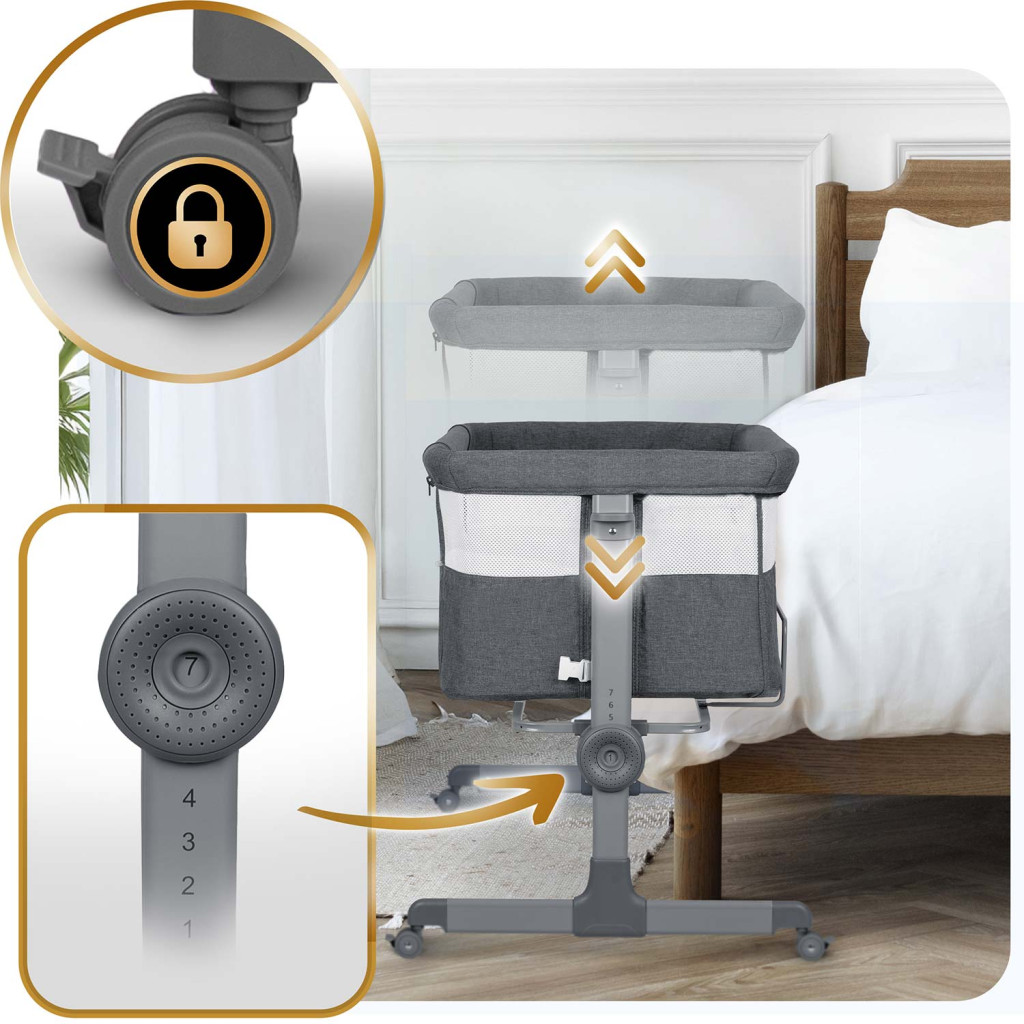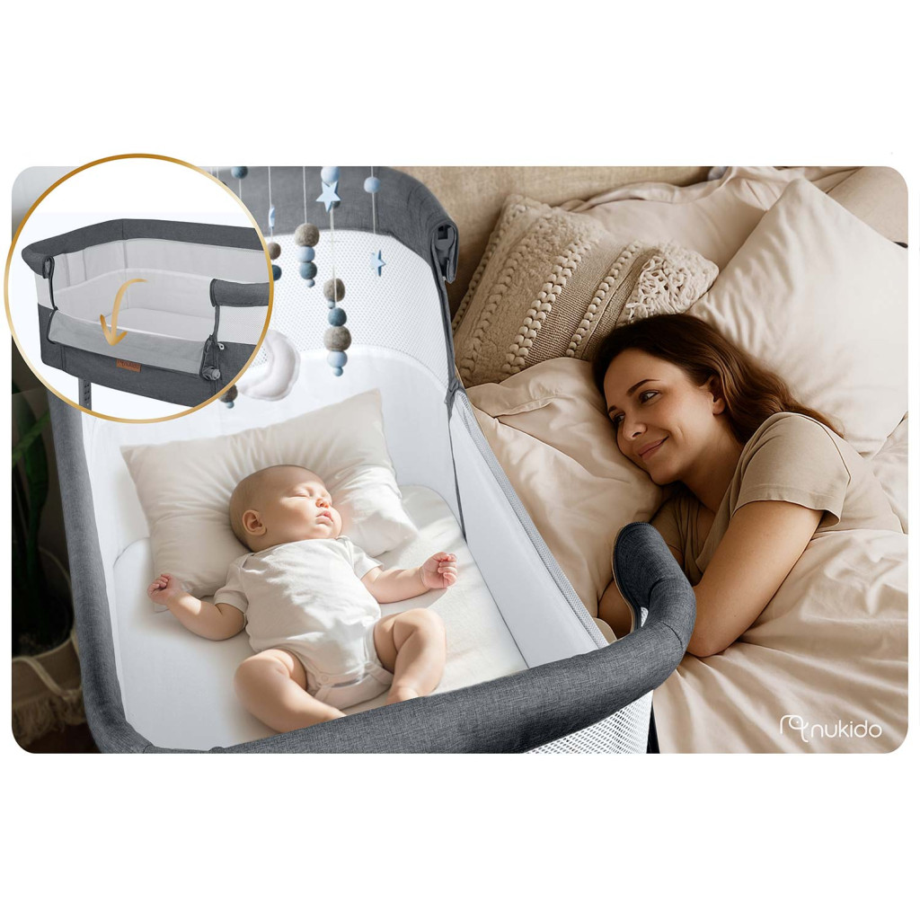 Élvezd a nyugodt, közös éjszakákat a Nukido NK-243 összecsukható babaággyal! A mindössze 8,8 kg-os, alumínium vázas konstrukció egyetlen mozdulattal felállítható, majd hét fokozatban 70–83 cm között állítható, így tökéletesen illeszkedik a szülői ágyhoz. A kétoldali, egymástól független magasságállítás enyhe lejtést is enged, ami megkönnyíti a légzést és csillapítja a refluxot. A hálós betétek folyamatos szellőzést adnak, a cipzárral lenyitható oldal pedig villámgyors hozzáférést biztosít a kicsihez.