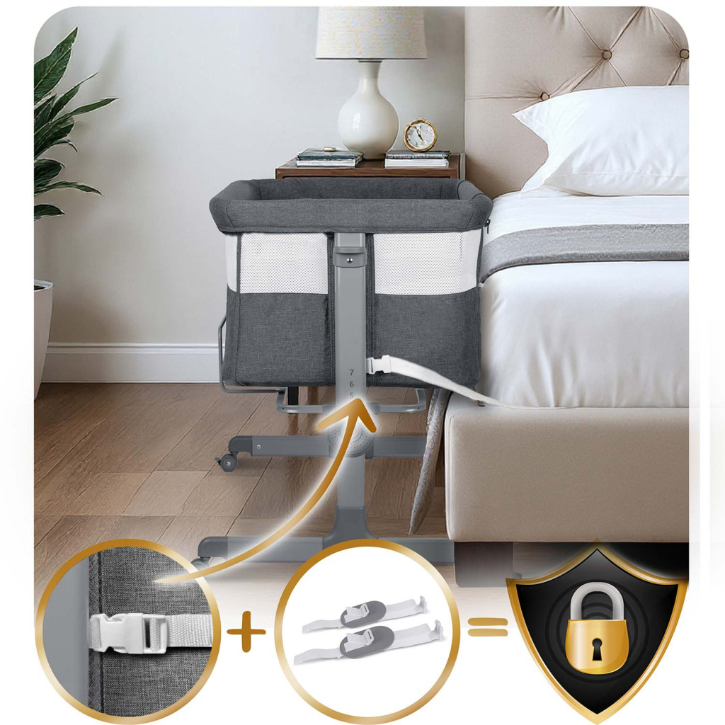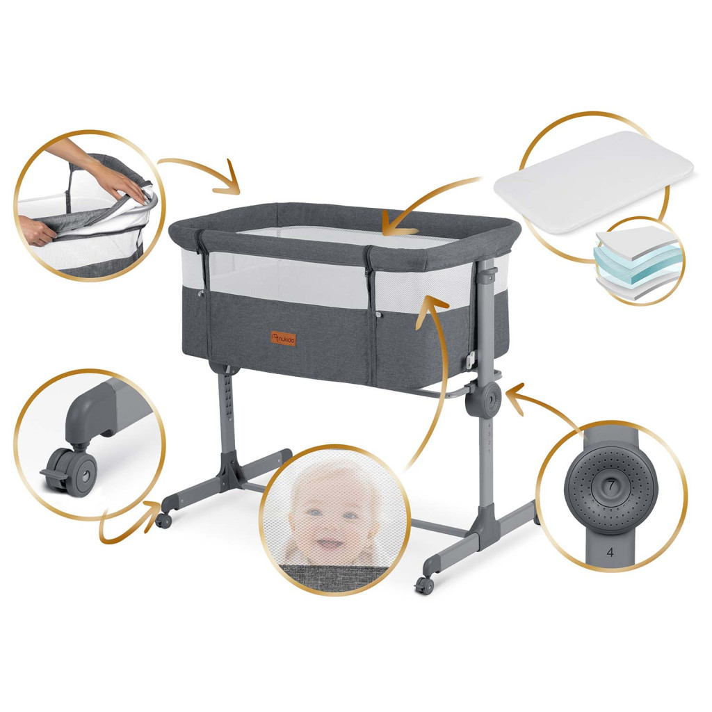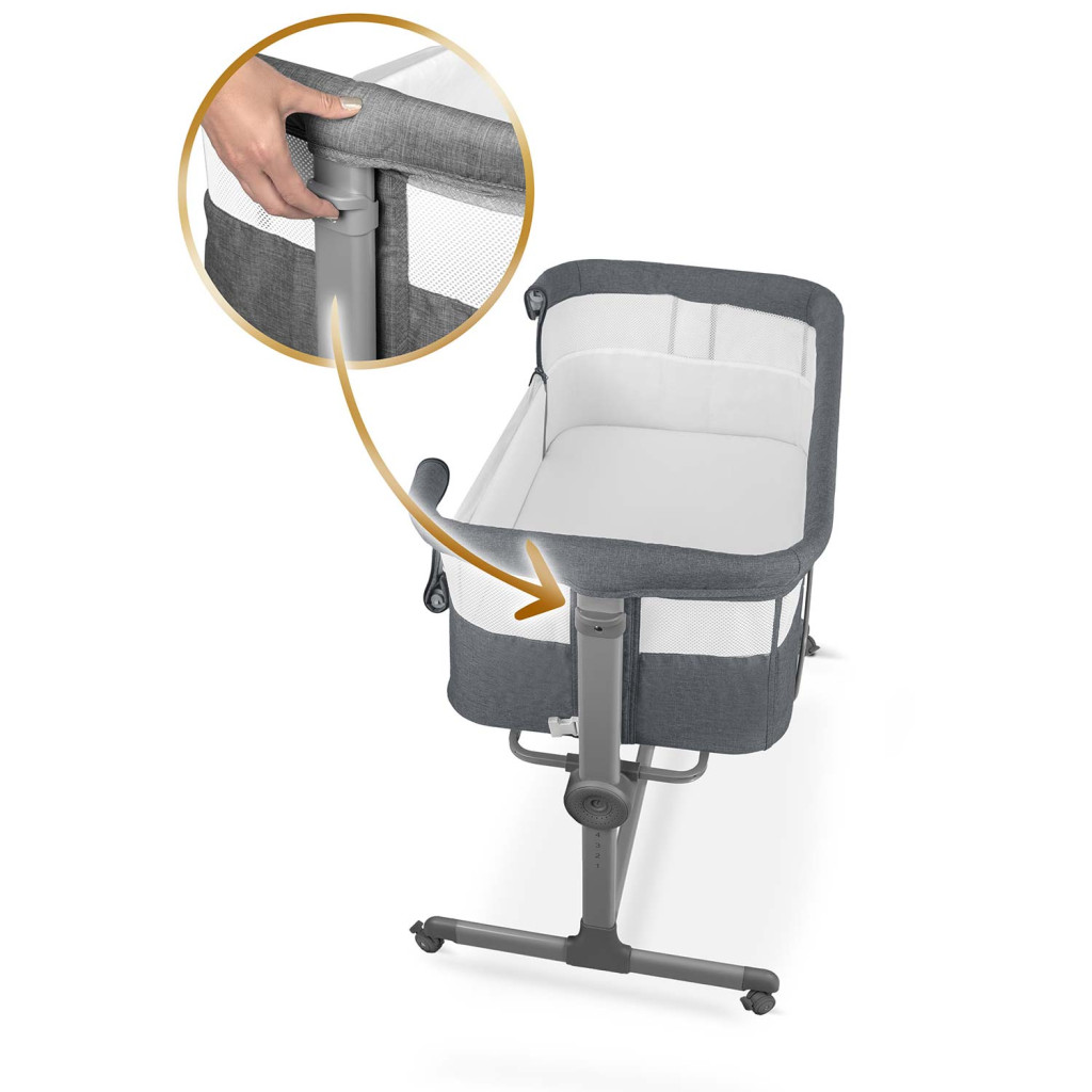 Az ágy közvetlenül a szülői matrac mellé rögzíthető, így a baba karnyújtásnyira alszik, ami csökkenti a felriadásokat, megkönnyíti az éjjeli etetést és erősíti a kötődést. A fékezhető négy keréknek köszönhetően nappal mobil kisággyá válik, követve a mindennapi ritmust. A tartozék 81 × 48 cm-es matrac levehető, mosható huzata higiénikus környezetet teremt, a gyors „Click” csuklórendszer pedig egyszerű utazótárssá teszi a terméket.