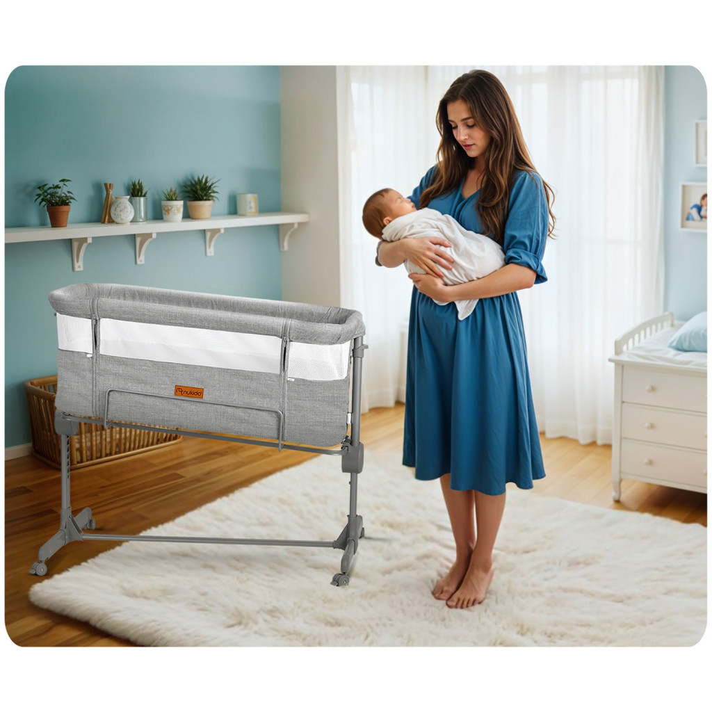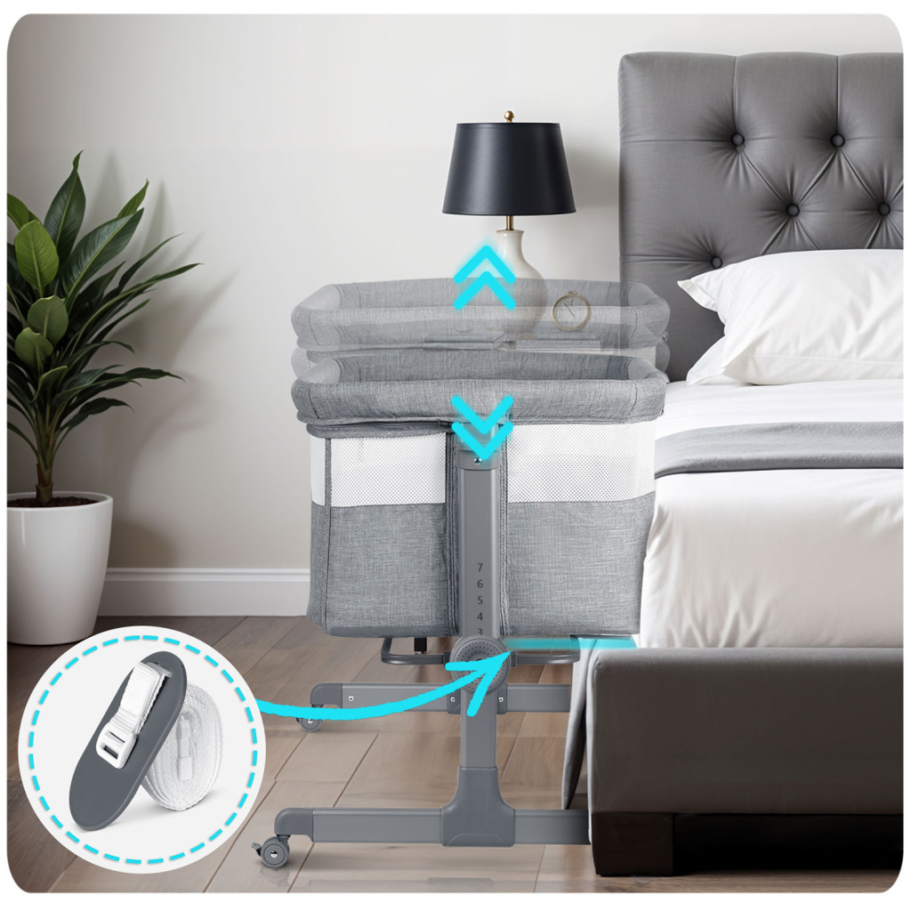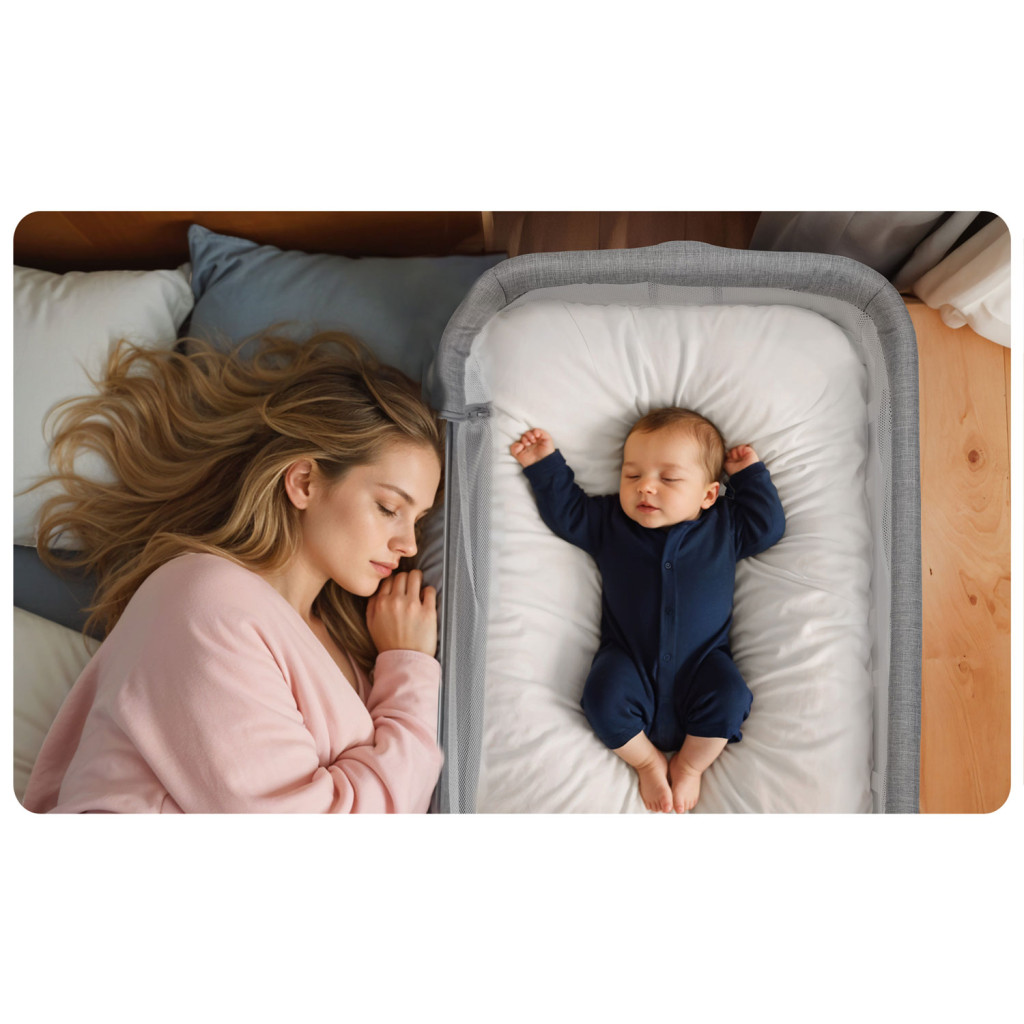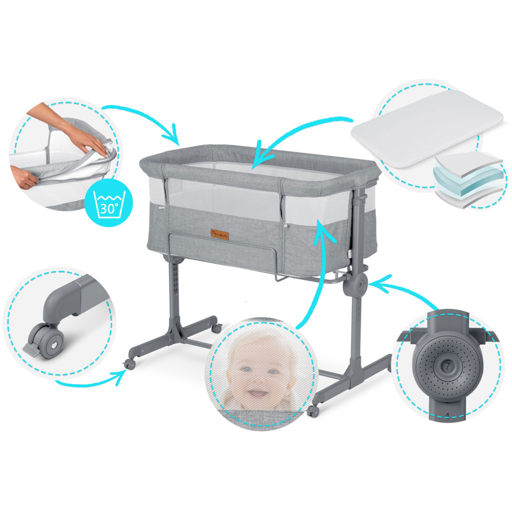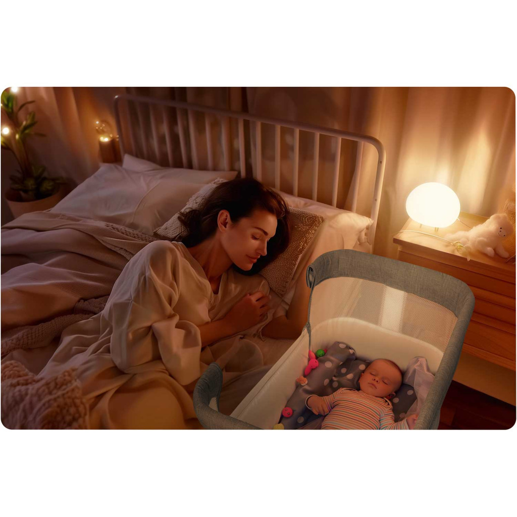 Éld meg a biztonságos közelség nyugalmát a NK-243 ágy mellé tehető babaággyal! A szürke textil elegáns, semleges kiegészítője minden hálószobának, miközben a 7 fokozatú, független magasságállítás könnyedén a szülői ágyhoz igazítható. A cipzárral nyitható oldalfal pillanatok alatt átjárhatóvá teszi a kiságyat, a légáteresztő háló pedig friss levegőt biztosít. Összecsukható, mindössze 8,8 kg, így könnyen áthelyezhető a fékezhető kerekeken.