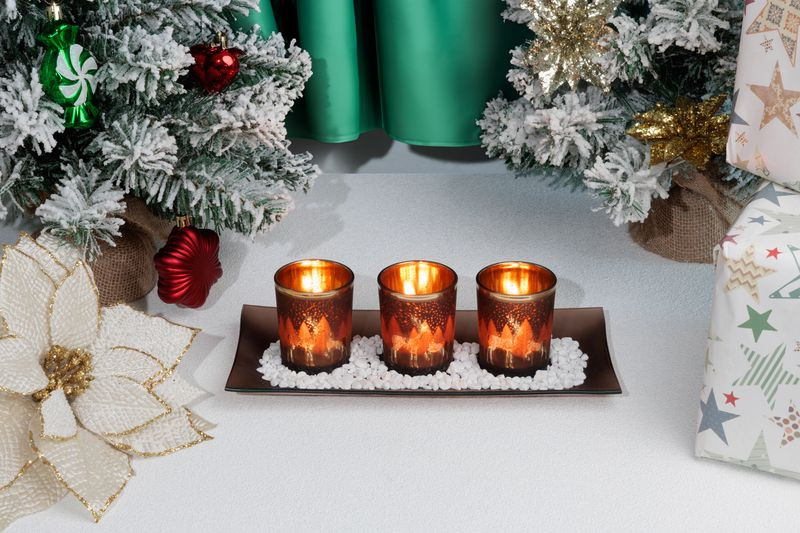Varázsold ünnepivé az otthonod hangulatát a MagicHome rézszínű gyertyatartó szettel! A 26×12×7 cm-es elegáns tálcán három, arany belsővel bevont üvegpohár kapott helyet, melyek 5,5 × 6,5 cm-es teamécsesekhez ideálisak. A fény a poharakban található szarvasmotívumon átszűrődve meleg, csillogó ragyogást teremt, miközben a fehér díszkavicsok letisztult, skandináv stílust csempésznek az asztalra vagy a polcra.