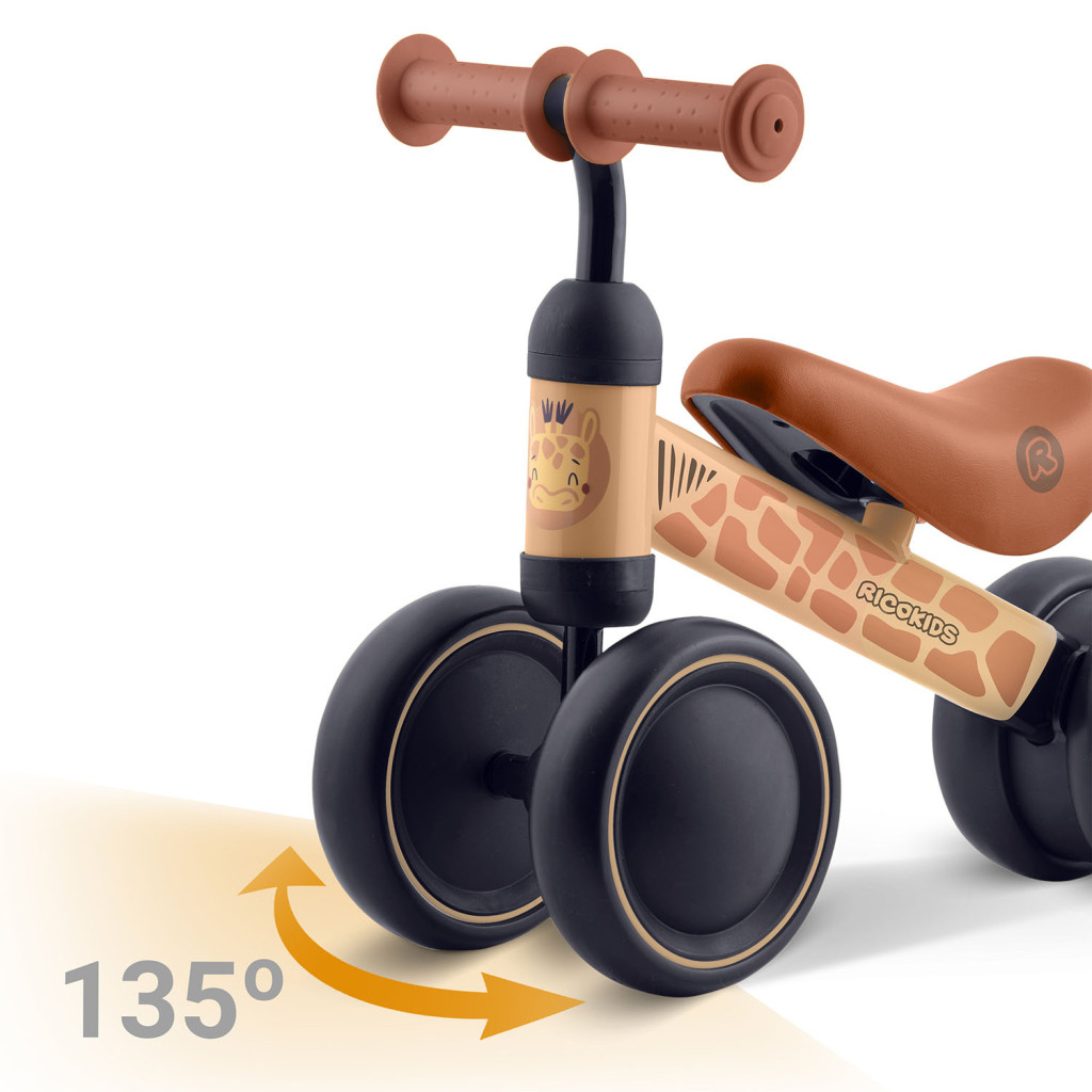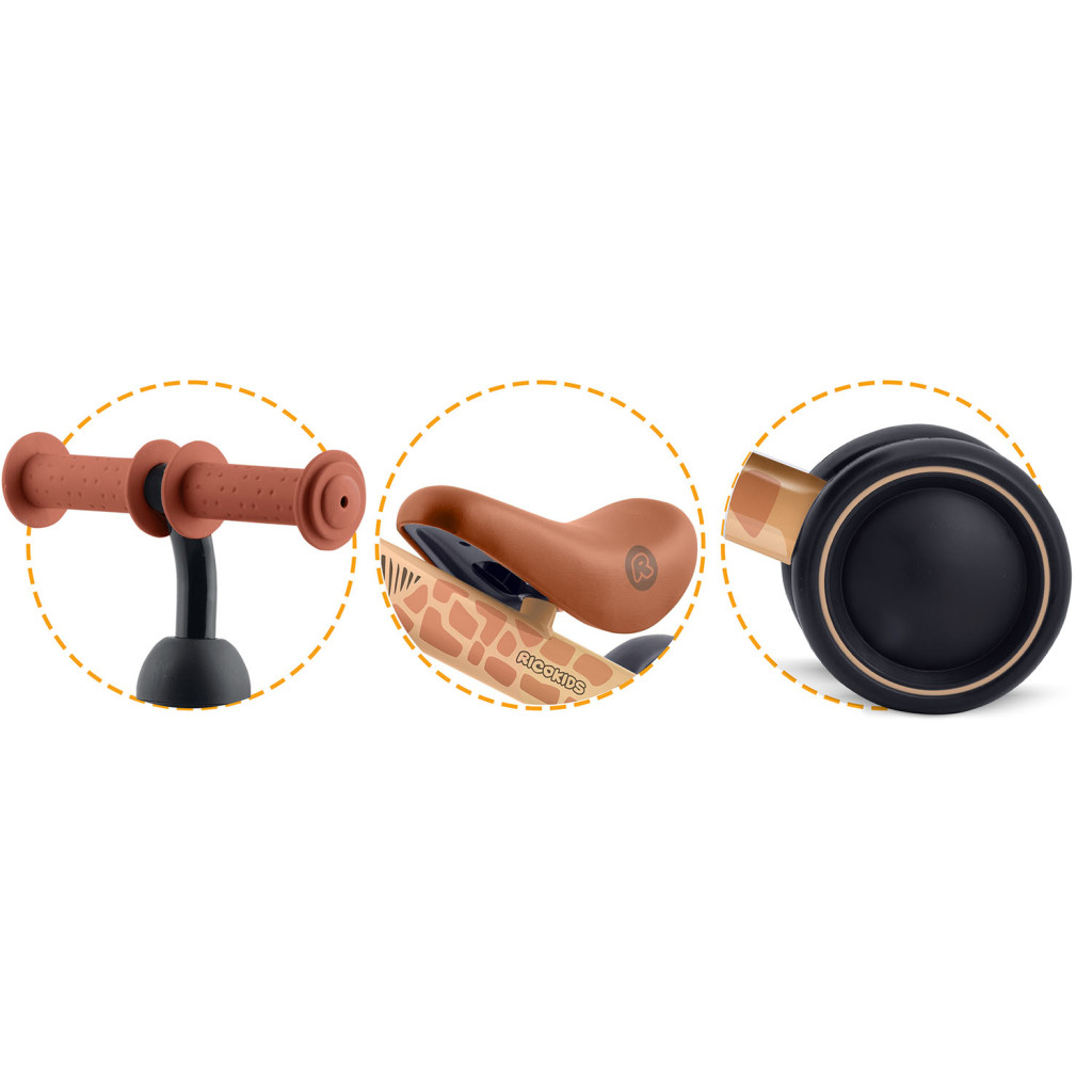 A Ricokids háromkerekű futóbicikli vidám zsiráfmintás vázzal és homokbarna kormánnyal varázsol mosolyt a legkisebbek arcára. A mindössze 2,3 kg-os saját tömegnek köszönhetően a szülők könnyedén hordozhatják, a gyerekek pedig fáradság nélkül manőverezhetnek vele. A három nagyméretű, fekete kerék bézs peremmel stabil tartást nyújt, így már az első gurulások is magabiztos élményt jelentenek. A lekerekített élek, a puha, ergonomikus ülés és a csúszásmentes markolat óvja a kicsik kényelmét, miközben fejleszti az egyensúlyérzéket és a lábizomzatot.