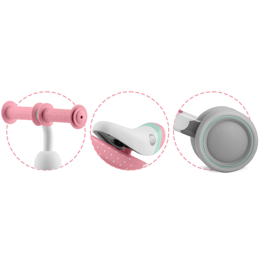 Száguld a fejlődés útján a Ricokids háromkerekű futóbiciklivel! A mindössze 2,3 kg-os könnyű váz már az első gurulásnál magabiztosságot ad a piciknek, miközben játékosan erősíti az egyensúlyérzéket. A rózsaszín, pöttyös csővázon mosolygó nyuszi grafika mindenkit kalandra csábít, a három, széles futófelületű kerék pedig stabilitást biztosít lakásban és járdán egyaránt. Az ergonomikus, párnázott ülés és a puha, csúszásmentes markolatok gondoskodnak arról, hogy a tanulás öröm, ne kihívás legyen.