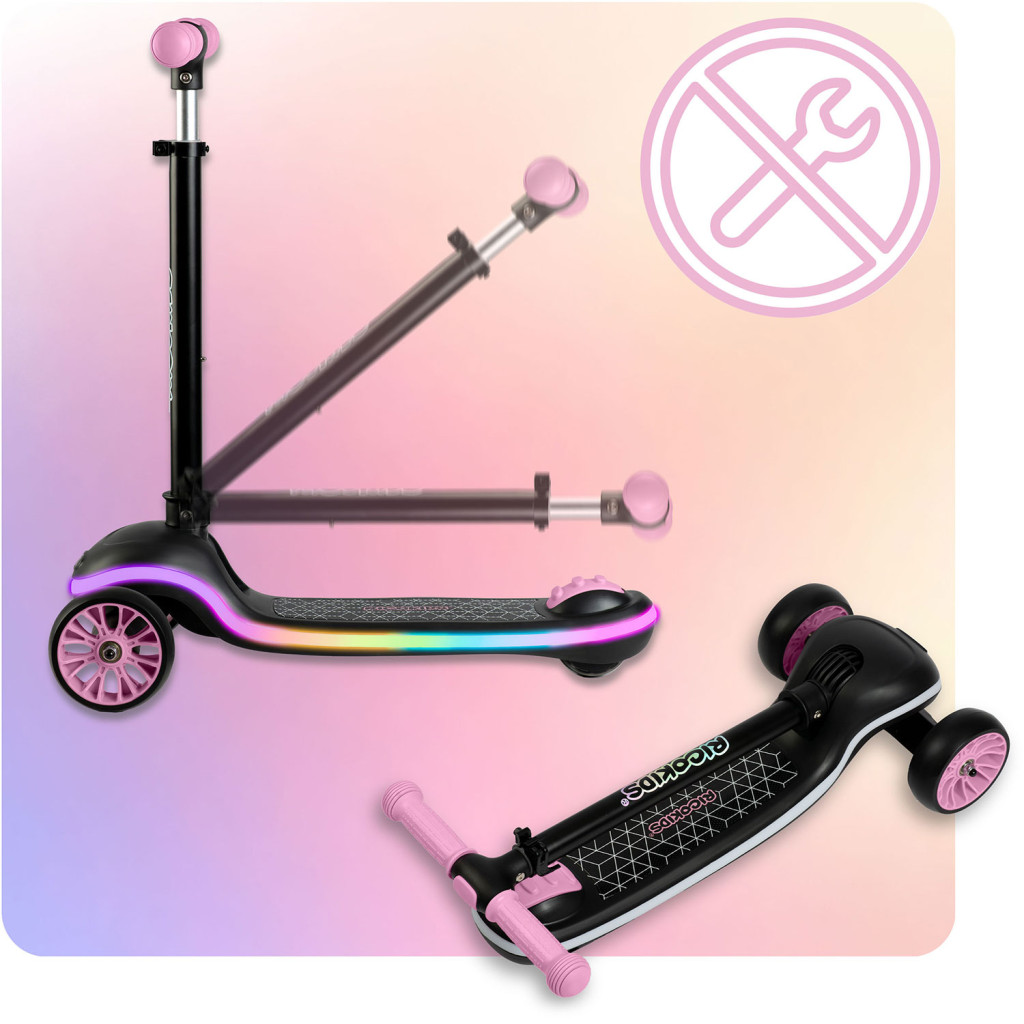 A Ricokids Leddi háromkerekű, balanszos gyerekroller játékosan fejleszti az egyensúlyérzéket. A fekete-rózsaszín vázba és kerekekbe épített LED fények látványosan világítanak gurulás közben, így a kicsik sötétedéskor is vidáman suhanhatnak. A könnyű, mindössze 4,3 kg-os szerkezetet a gyerekek is egyszerűen irányítják: a kormány enyhe döntésével fordul, a széles fellépő pedig stabil tartást biztosít. Összecsukható kialakítása révén a roller pillanatok alatt befér a csomagtartóba vagy a gardróbba.
