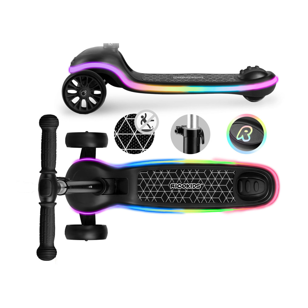 A Ricokids Leddi háromkerekű LED roller úgy készült, hogy már az első gurulásnál magával ragadja a gyerekeket. A stabil, döntéssel kormányozható szerkezet megkönnyíti az egyensúlyozást, így a legkisebbek is gyorsan ráéreznek a mozgás örömére. A fellépő oldalán végigfutó, színpompás LED fénycsík látványossá varázsolja az esti sétákat, miközben a csúszásmentes borítás biztonságot nyújt. A mindössze 4,3 kg-os váz könnyen emelhető, az összecsukható kialakítás pedig megkönnyíti a szállítást.