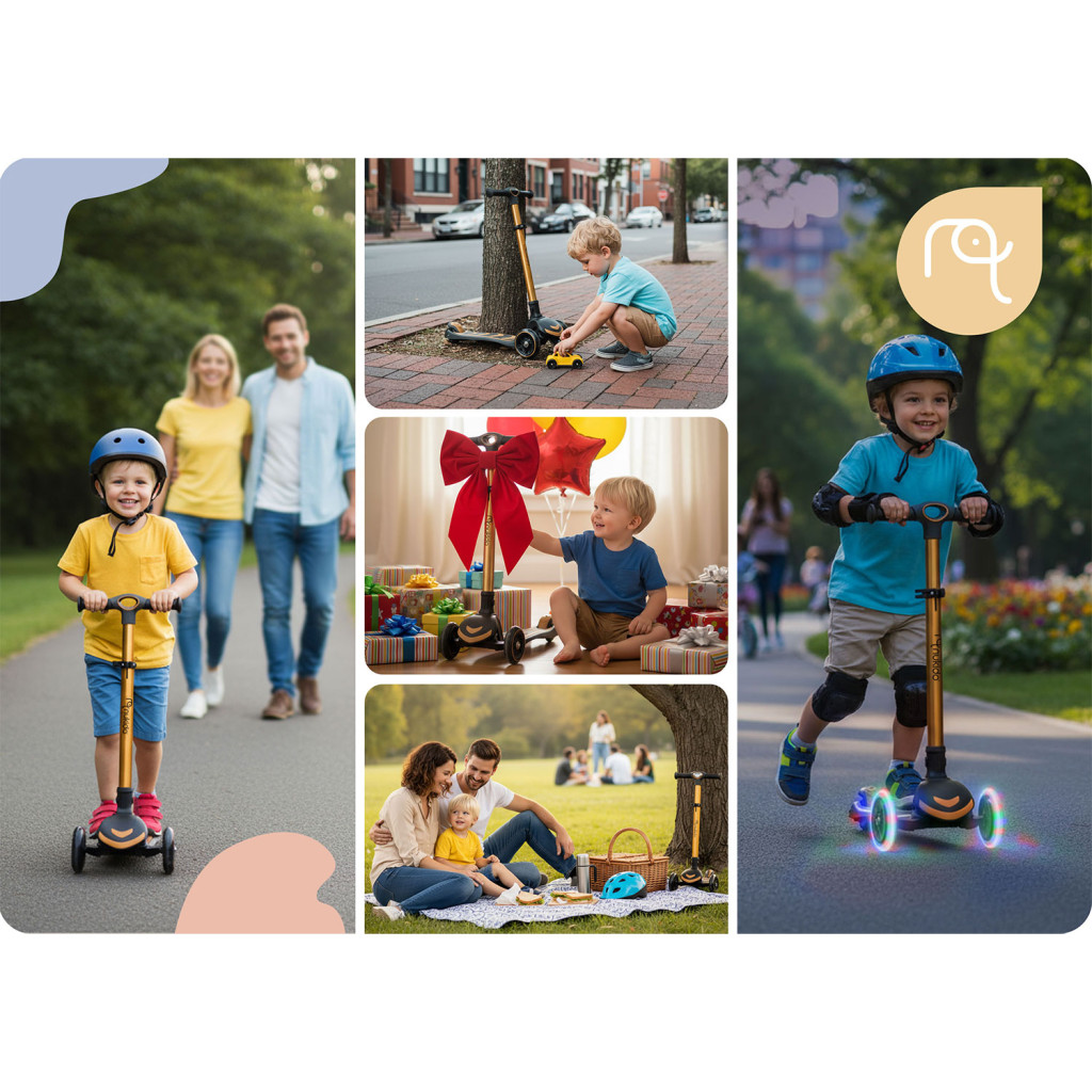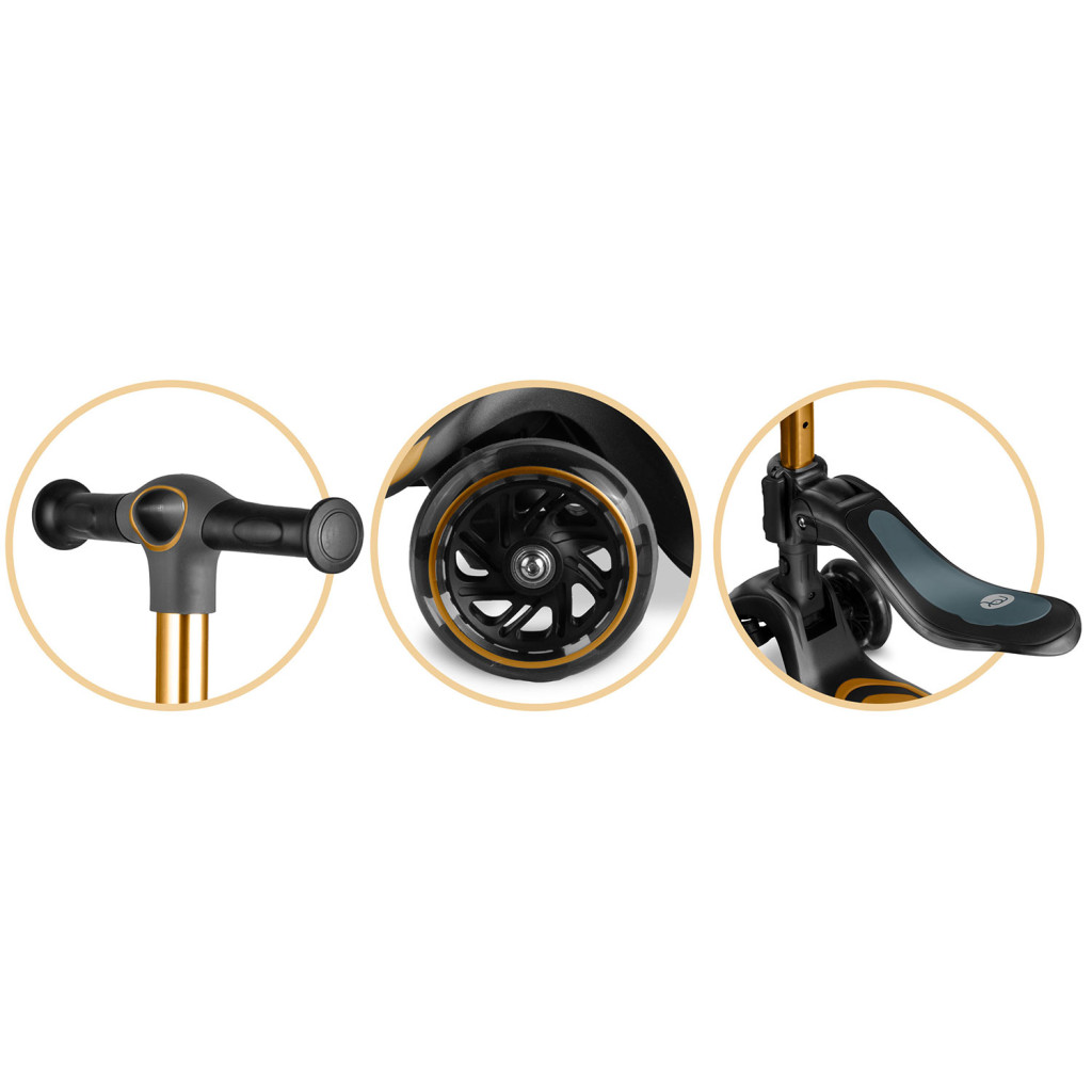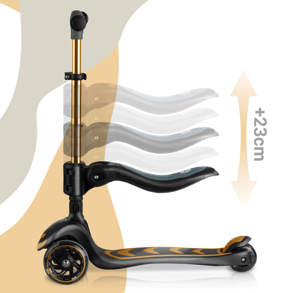 Száguldj stílusosan az aranyszínű Nukido Flippo háromkerekű balanszrollerrel, amelyet kifejezetten a kis felfedezők igényeire terveztek! A széles, csúszásmentes fellépő biztos tapadást nyújt, a könnyű alumínium kormányszár három fokozatban állítható, hogy éveken át kövesse a növekedést. A le- és felszerelhető, magasságban szabályozható ülés pihentető utazást kínál, míg a nagy, LED-fényes kerekek halk gurulást és látványos játékot garantálnak. 50 kg teherbírás, EN71 és CE minősítés.