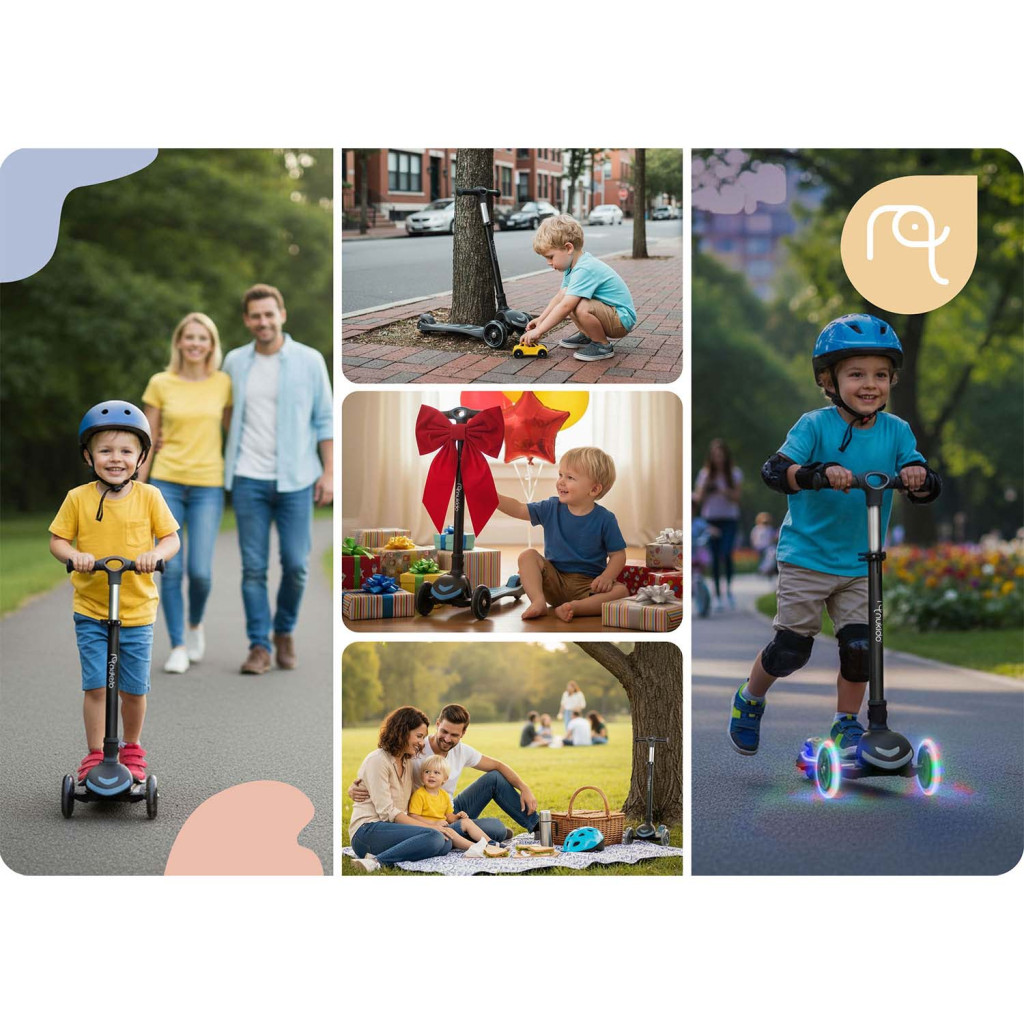Az irányítás nem igényel kormányfordítást: a kicsi a testével dőlve kormányoz, így játék közben ösztönösen fejleszti az egyensúlyérzékét. A három nagy kerék folyamatosan függőlegesen tartja a rollert, a hátsó lábfék pedig azonnali megállást biztosít. Az alumínium kormányszár pehelykönnyű, mégis strapabíró, a csúszásgátló platform pedig bármely cipőtalpat magabiztosan megtart, így a Flippo ideális társ óvodába, parkba vagy családi sétákhoz.