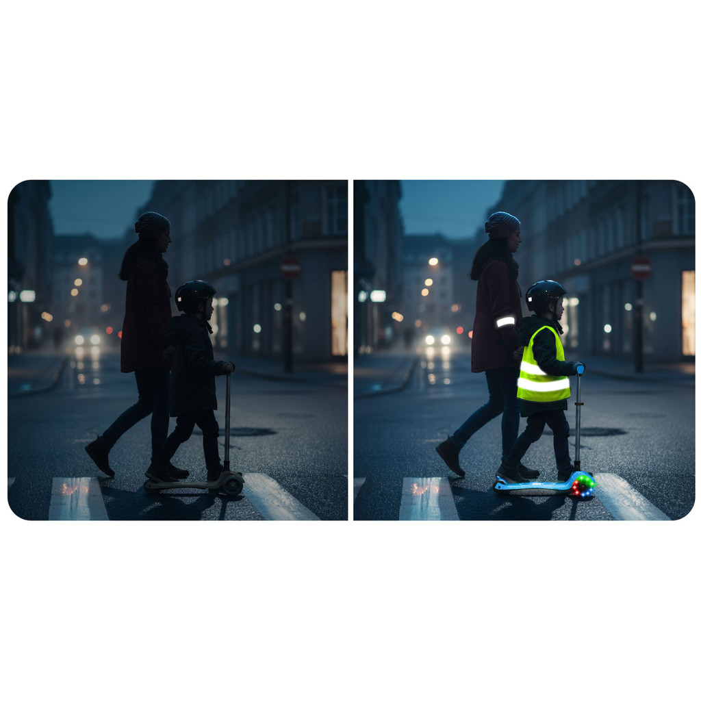 Kormánytekergetés helyett elég a testsúlyodat finoman jobbra vagy balra billenteni, így a kanyarodás természetes mozdulattá válik, miközben fejleszti a koordinációt. A LED-es világítás jó láthatóságot biztosít alkonyatkor is, plusz minden suhanás igazi fényshow-vá alakul. A széles fellépő elnyeli a rezgéseket, a csúszásmentes mintázat pedig szárazon és nedvesen is megbízható tapadást nyújt. A tartós műanyag platform és a robusztus alumínium alkatrészek hosszú évekre szólnak, így a roller kis testvéreknek is továbbadható.