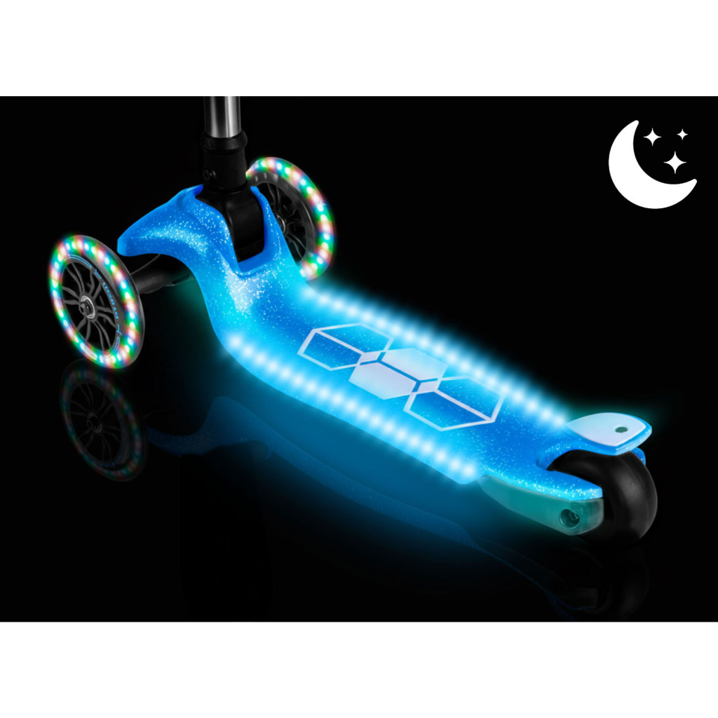 Ragadd meg a kaland ízét a Ricokids Jelly kék, háromkerekű balanszrollerrel! A széles, csúszásgátlós fellépő és a pehelysúlyú, mégis masszív alumínium kormányszár gondoskodik a stabilitásról, miközben a beépített LED-panelek és a menet közben felvillanó kerekek varázslatos fénycsíkot húznak maguk után. A 3,2 kg-os konstrukciót gyerekjáték cipelni, a 3 fokozatban állítható kormány pedig együtt nő a kis motorossal egészen 50 kg-ig. A balanszos kanyarodási rendszer ösztönzi az egyensúly fejlődését, a nagy első kerekek és a hátsó lábfék pedig gondoskodnak a biztonságos megállásról.